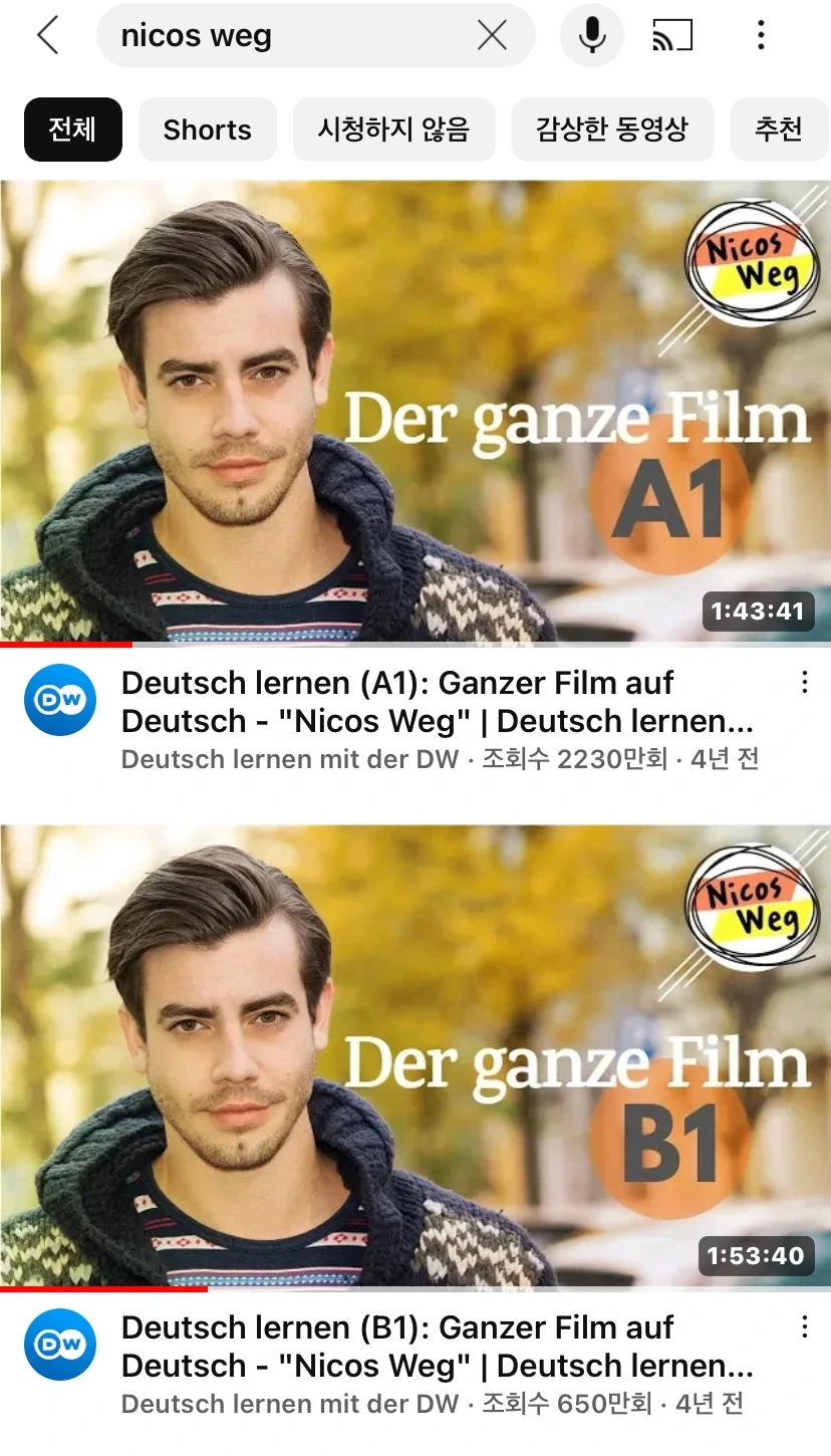 'Deutsch lernen: Ganzer Film auf Deutsch'로 1시간 50여분 A1, A2, B1 풀영상이 올라와 있다.