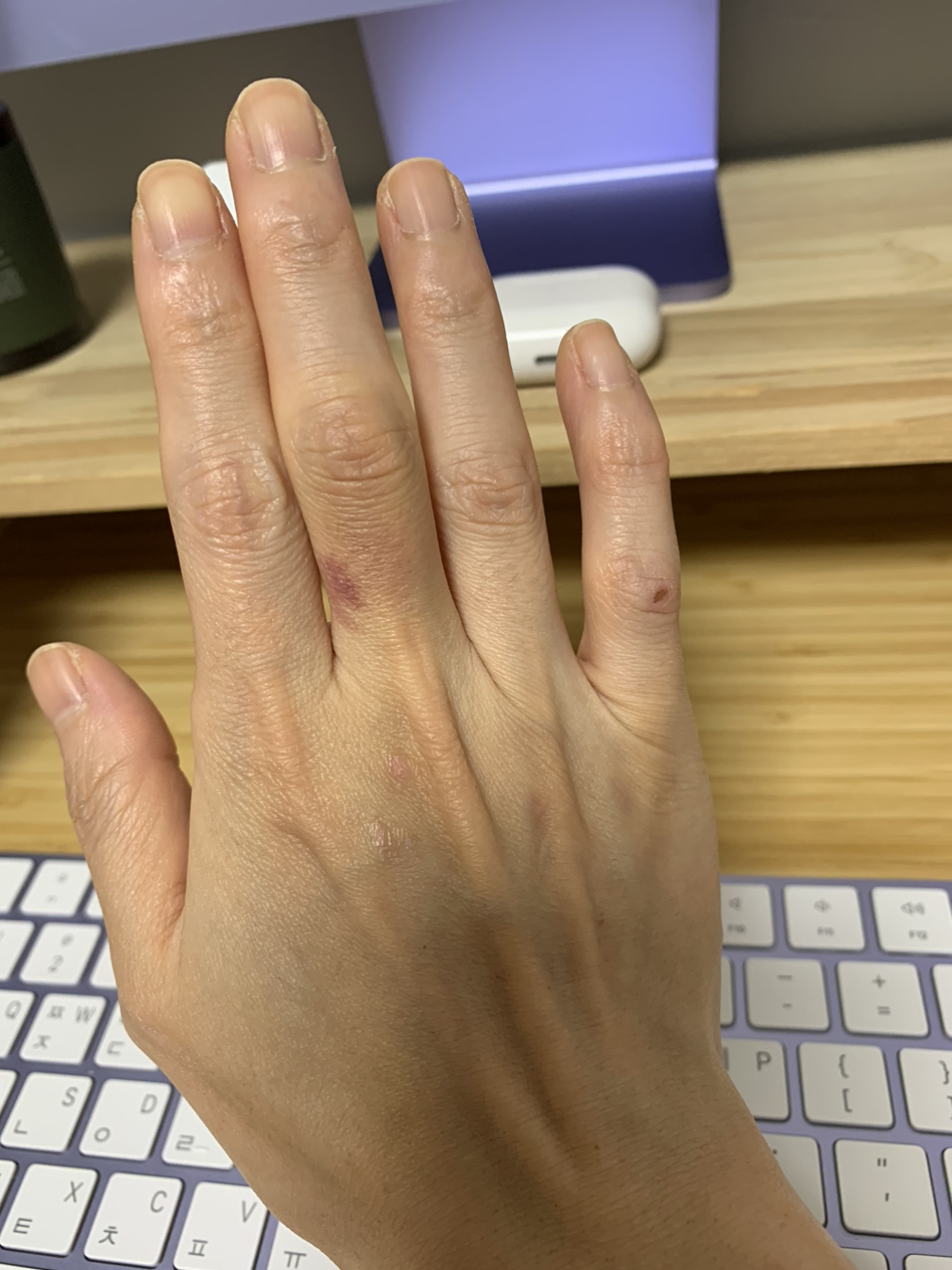 멍이 들어 색이 화려해져 간다. 손도 붓고..