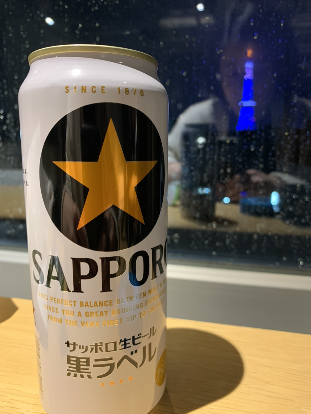 지금 도쿄타워를 마주 보며 맥주를 마시고 있다.