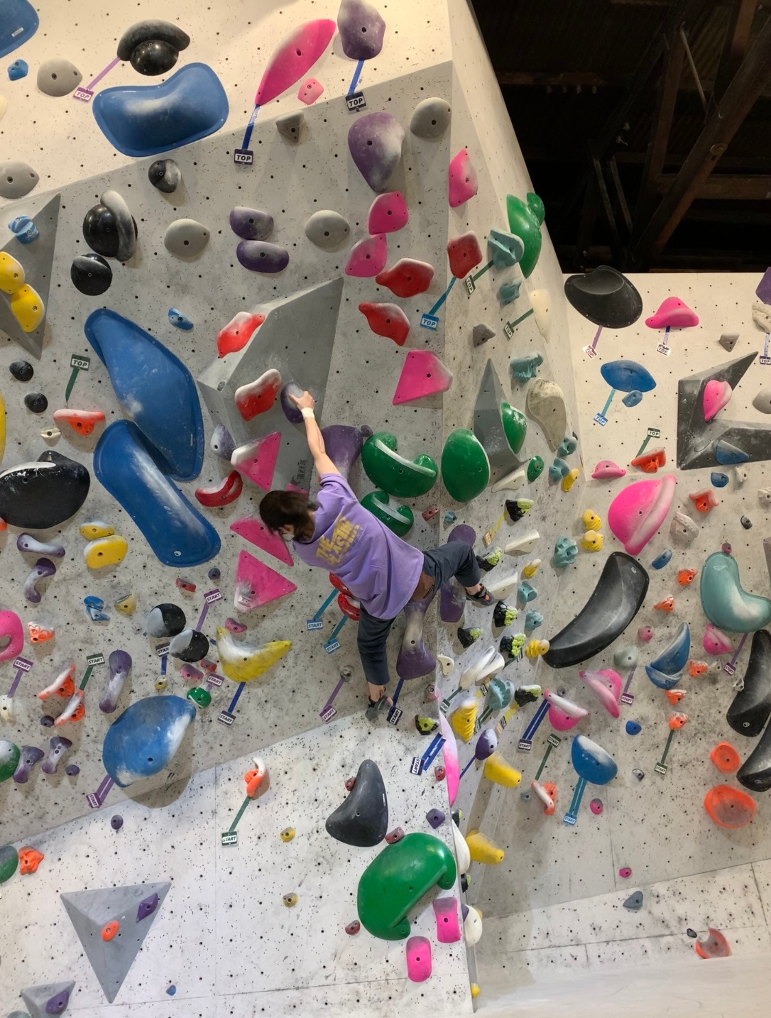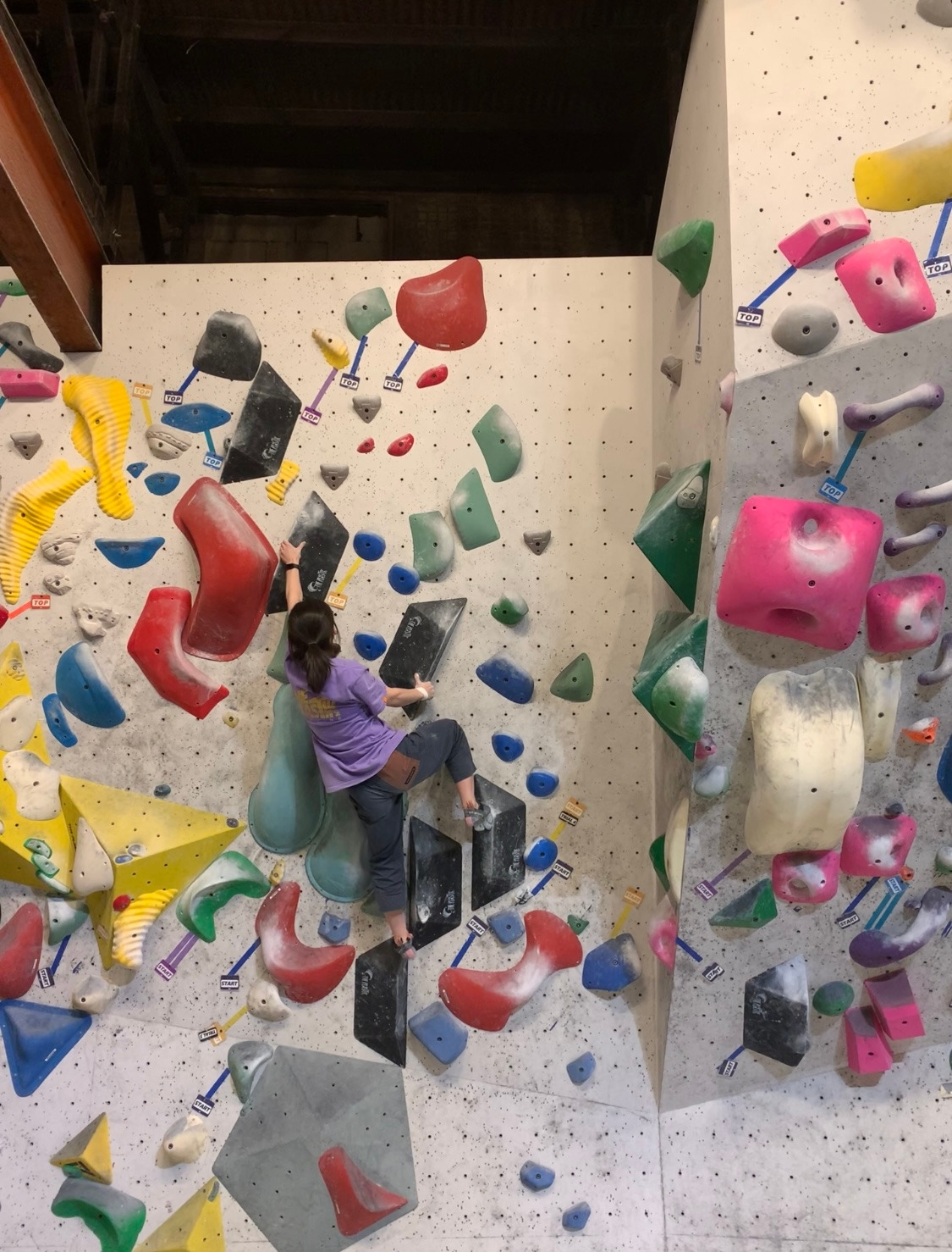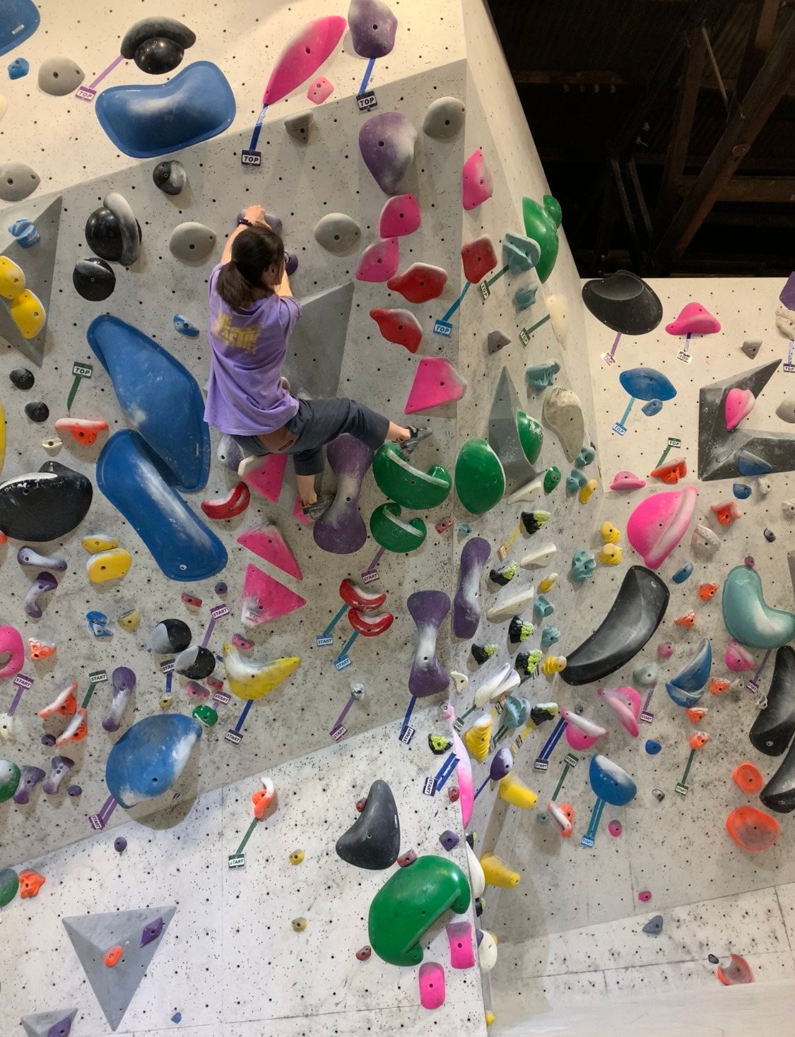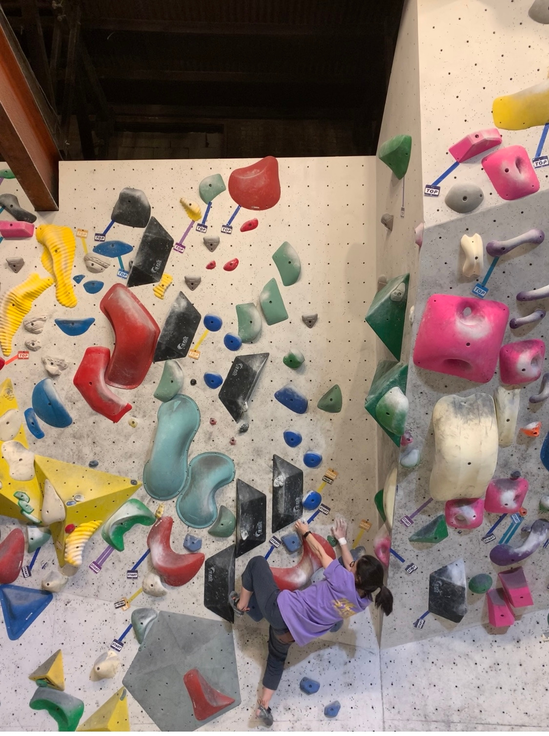 핑크 남색은 스타트 홀드부터가 리치가 딸려서.. 약간 빡?쳐 있었는데 날개쭉지가 찢어지는 고통을 느끼며 오른쪽 toe hook으로 간신히 입구컷은 면했지만, 탑 전 홀드가 저리 멀지는 또 몰랐네.. 다음번에 있는 힘껏 쳐내야겠어요. 아.. 아쉬운 문제..