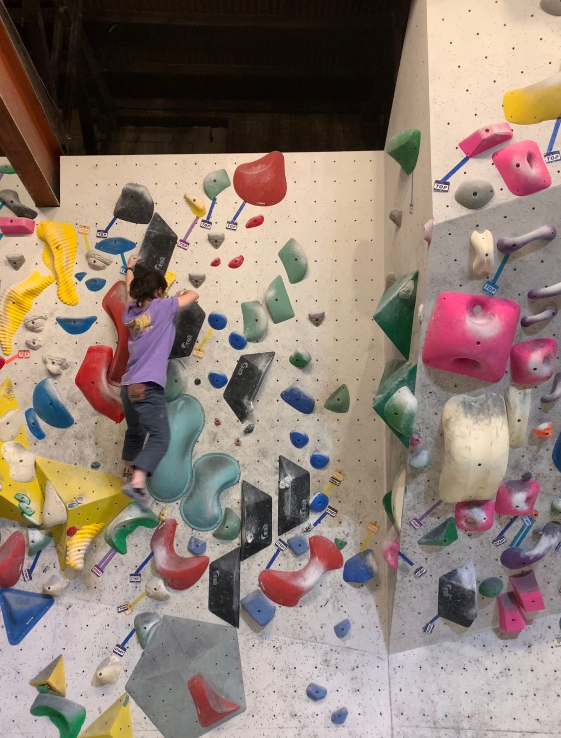 마지막 존버 문제. 노랑 보라색 난이도.. 중간에 오른손을 쭉 뻗어서 홀드를 잡아야 하는데..
