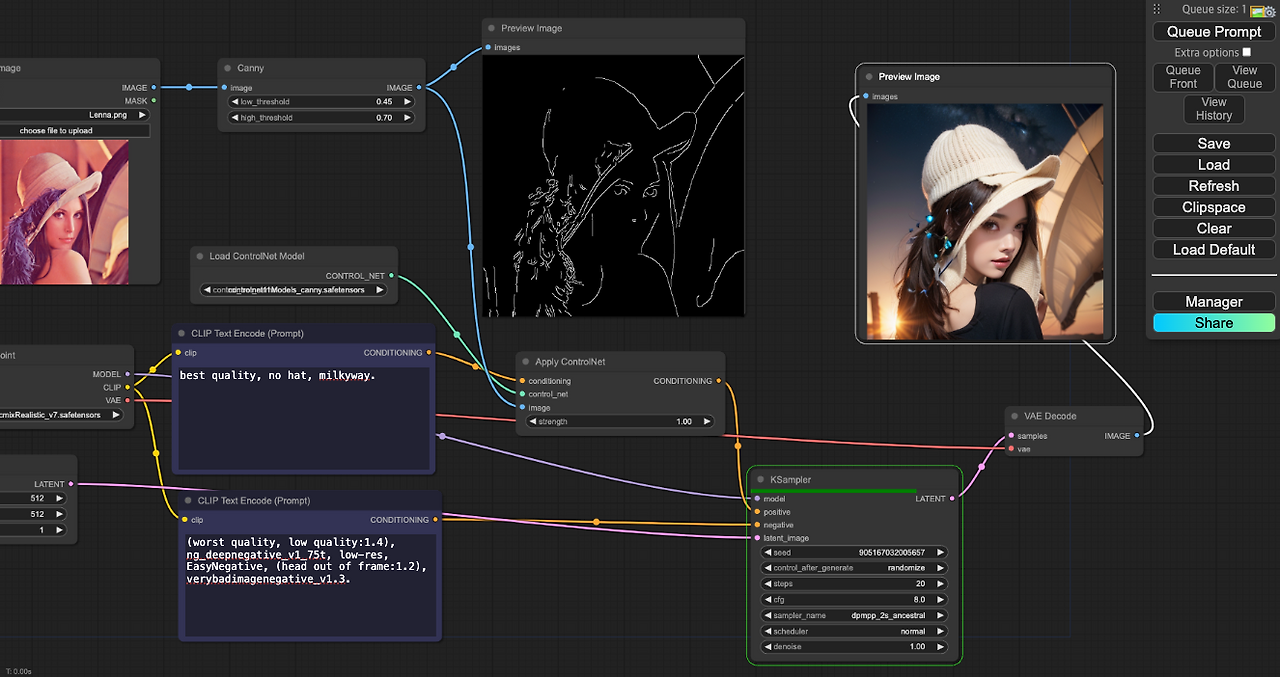 저 그림은 ComfyUI라는 새로운 생성AI기반 GUI프로그램을 사용하여 입력한 레나 이미지로부터 Canny Edge 이미지(검은 이미지)를 만들고 그렇게 만들어진 입력이미지에 대한 뼈대(features)로부터 입력과 유사하지만 또다른 새로운 이미지를 만드는 장면입니다.
