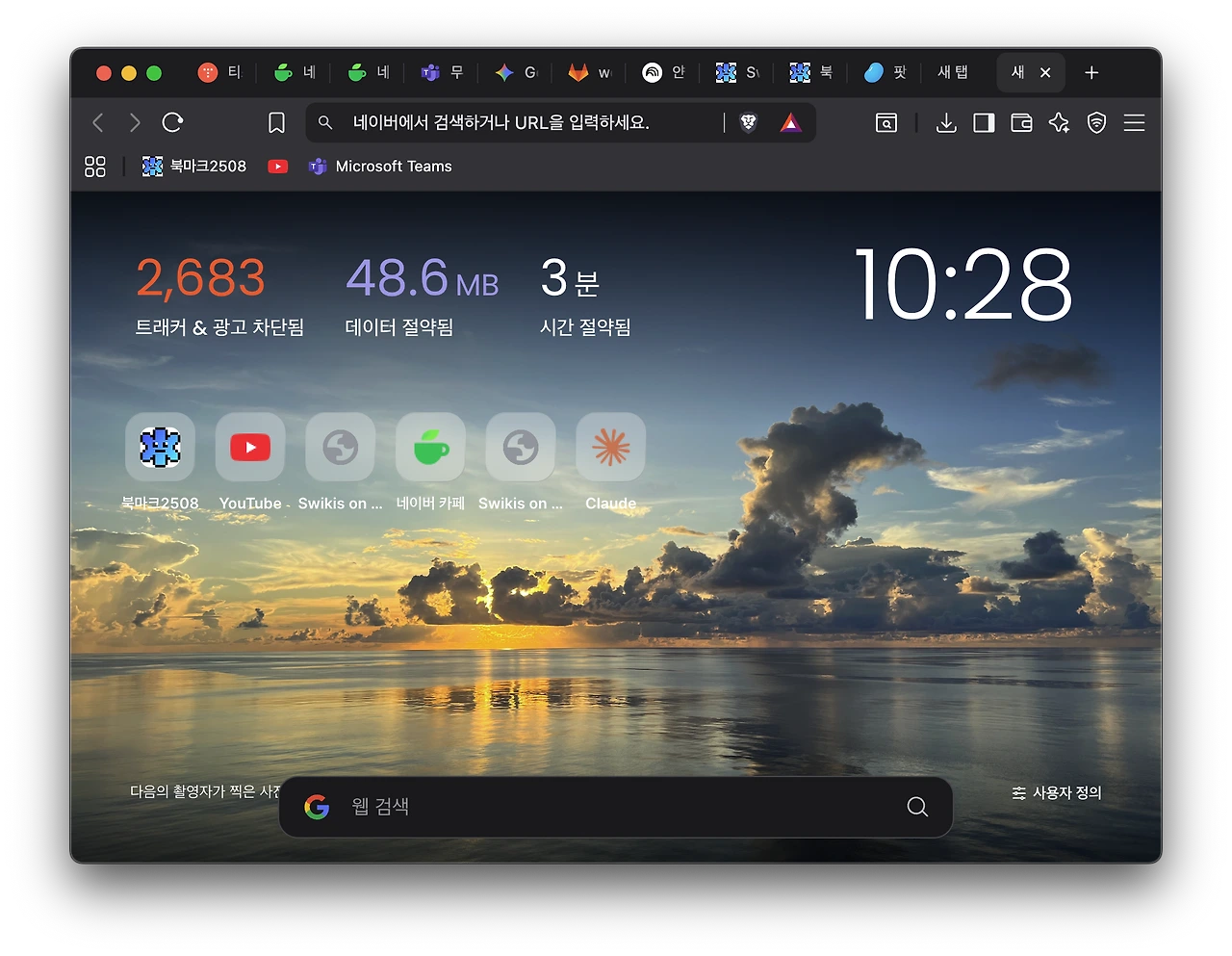 새 페이지를 열면 저렇게 현재시각과 차단된 광고수 등이 통계수치로 표시됩니다.