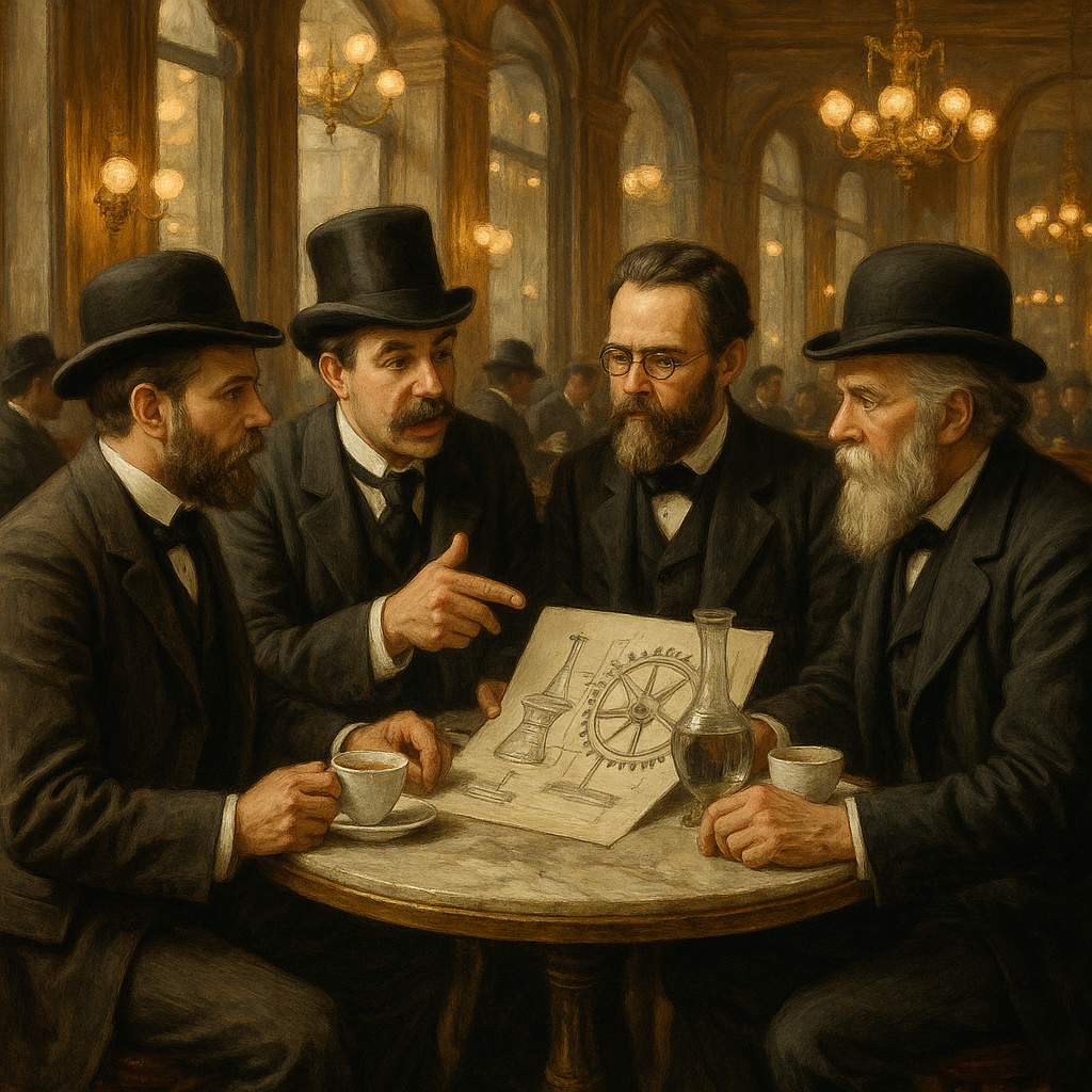 이 그림은 19세기말에 당대 최고의 엔지니어들이 신사복을 멋지게 차려입고 당시의 고급 문화교류의 장소인 카페에 모여서 커피를 마시며 과학기술에대해 토론하는 모습 입니다.