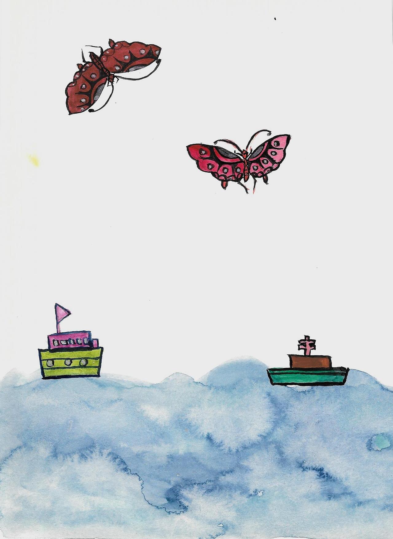 동생 나비는 수평선 너머 빨갛게 지고 있는 석양을 바라보며 '저 바다 너머에는 또 어떤 세상이 있을까? 어쩌면 더 찬란한 세상이 있을지 몰라. 가 보고 싶다.' 하며 바다 끝이라도 볼 것처럼 더 높이 날아보려 날개를 활짝 폈습니다.
