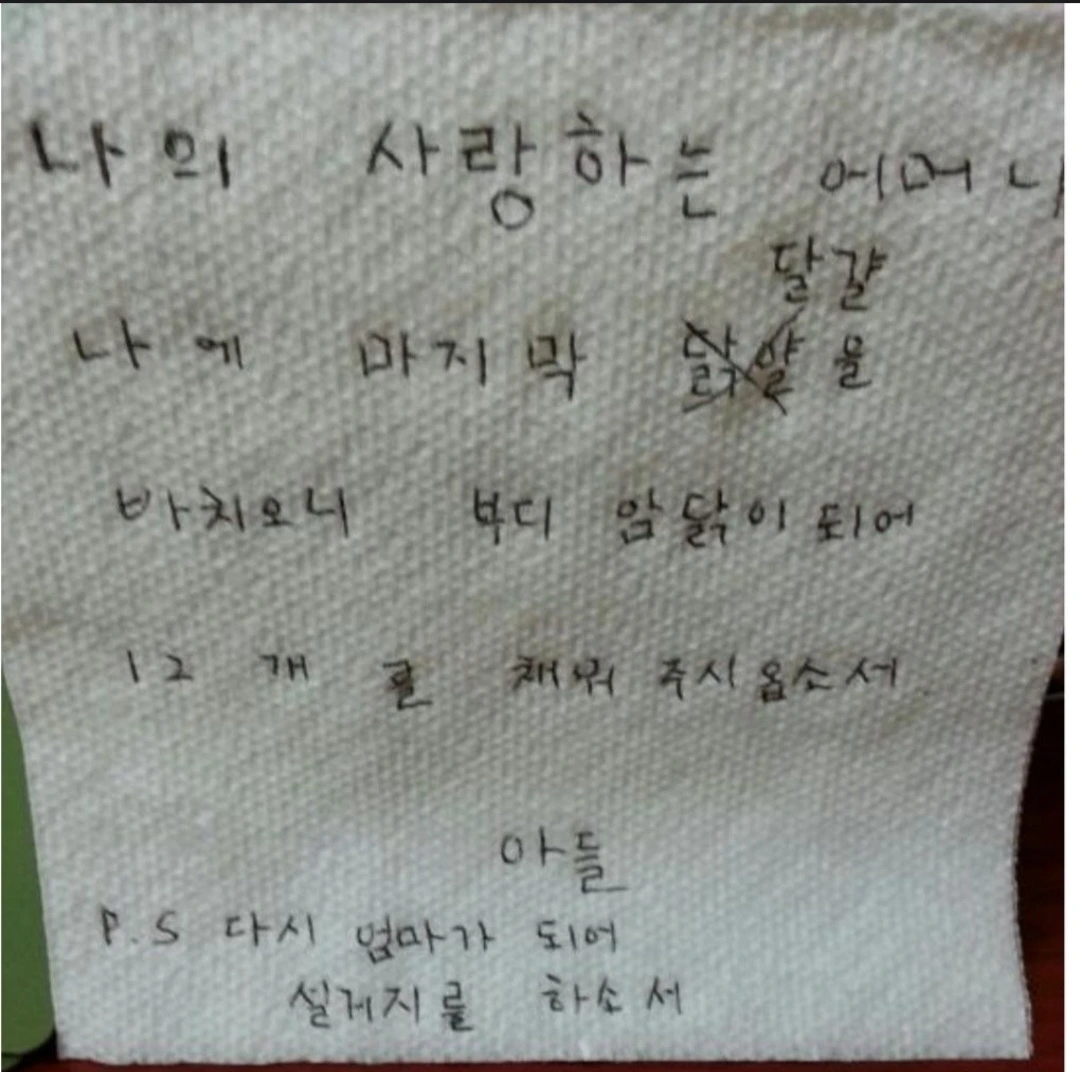 집에 왔더니 식탁 위에 차려놓은 밥상과 함께 아들의 메모가 눈에 띄었다.(필체가...ㅎㅎㅎ)