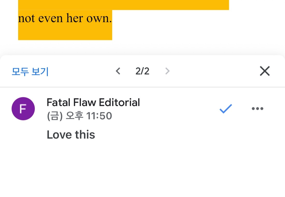 그들은 마지막 단락에 하이라이트를 쳐 두었는데, 마치 그 문장의 맥박 위에 엄지손가락을 대고 꾹 누르는 것 같았다.