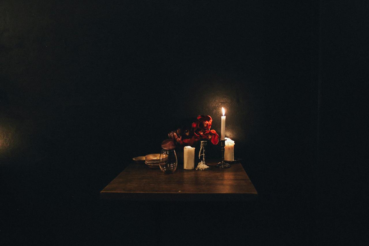 하나는 결코 도착하지 않을 온기를 약속하고, 다른 하나는 목적지 없는 길을 안내한다. 장미 꽃잎의 벨벳 같은 무게와 비자리아의 날카로운 껍질 사이에서, 방은 간신히 유일한 균형을 찾는다. 꽃들은 아름답게 꽃병에 꽂혀졌고, 엉망진창은 그렇게 그저 그 자리에 붙들려 있다.