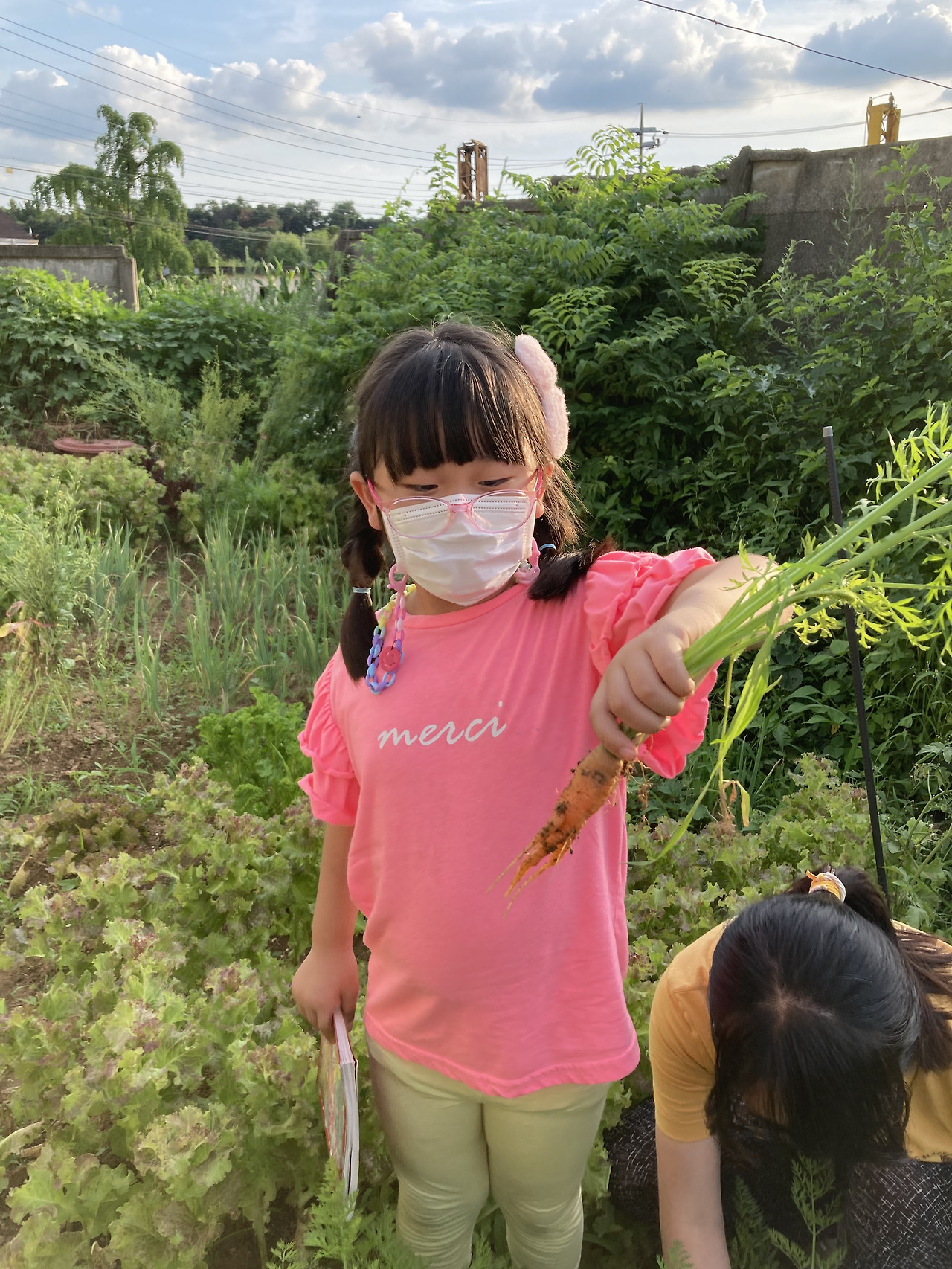 당근은 당근인 줄만 알았는데 씨앗으로 심는단다. 자그마한 고랑을 내어 쪼르르 심은 씨앗이 정말 당근이 되었다. 땅속에서 자라는 작물은 보물 찾기와도 같아서 어떤 모습일지 상상하는 재미가 있다. 당근은 잎부터 "나 당근이야"하고 티를 낸다. 누구나 뾰족뾰족한 당근잎을 보면 당근밭을 알아볼 수 있다. 잎이 잘 자라는 것을 보다가 땅 쪽으로 살짝 고개를 내민 주황색이 보이자 궁금함을 참을 수가 없다. 당근씨를 심은 곳에 당근이 자라는 것은 당연한 일인데 너무 신기해서 보고 또 보게 된다.