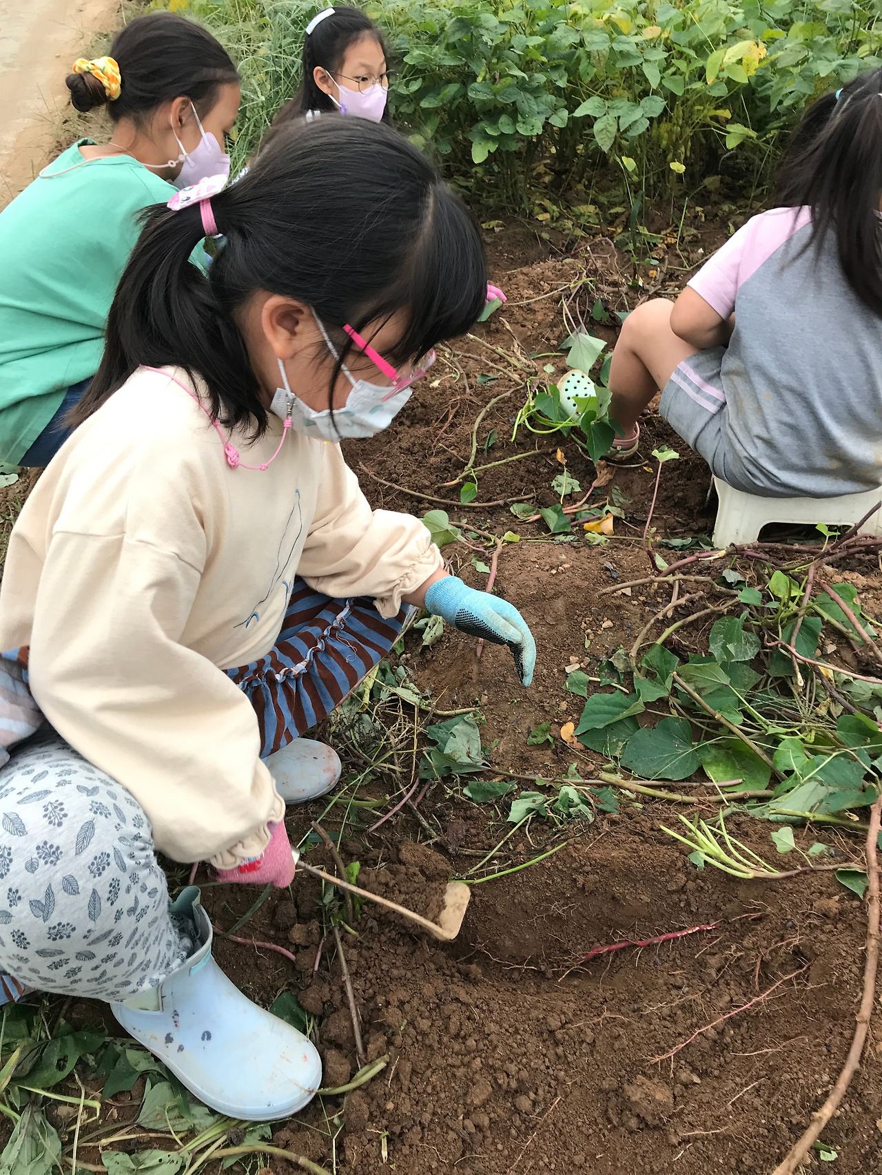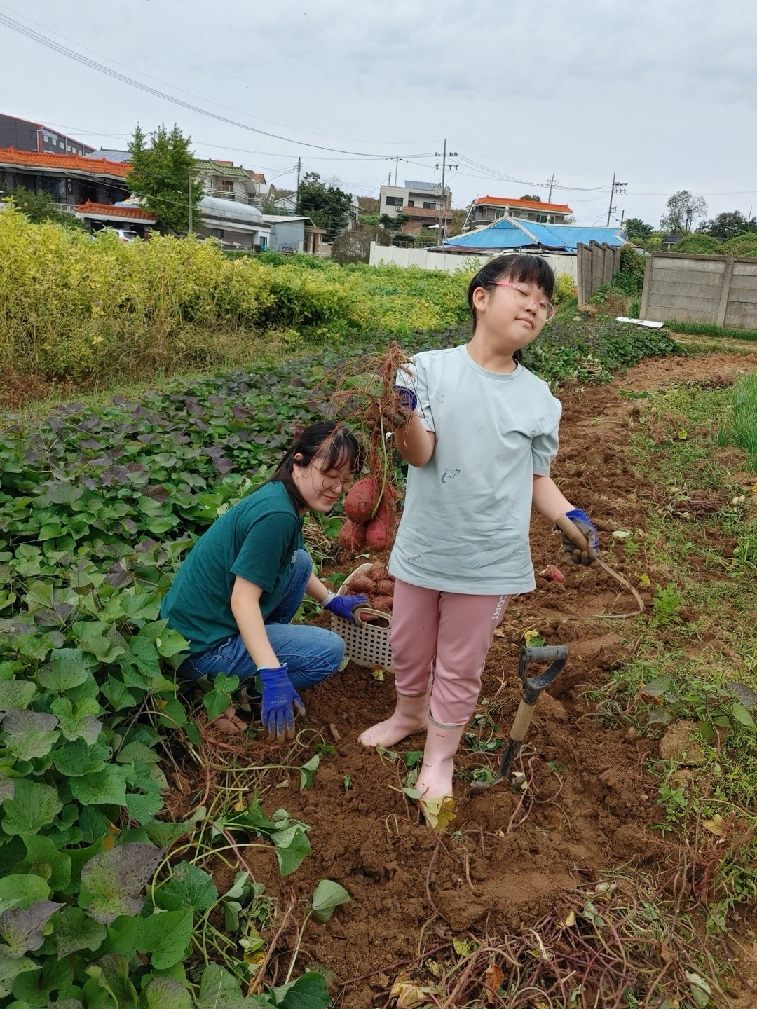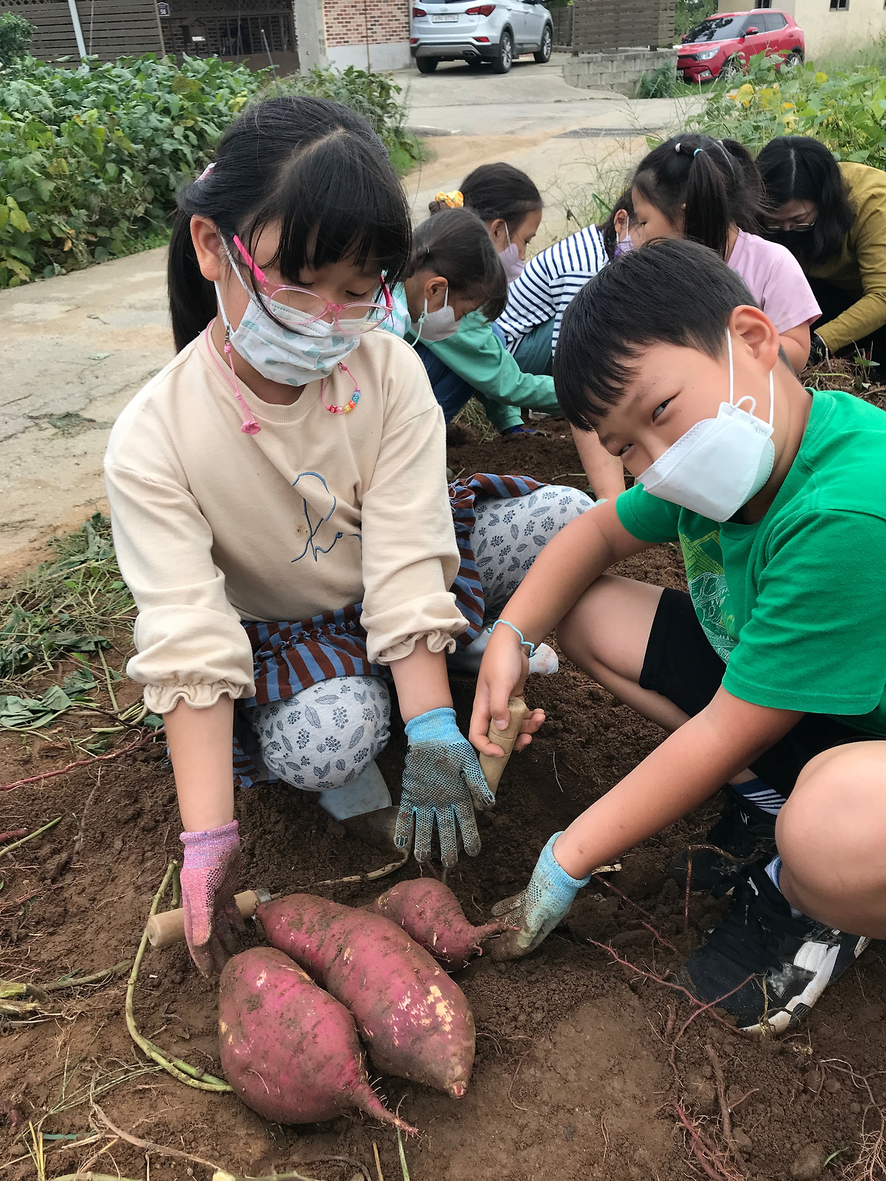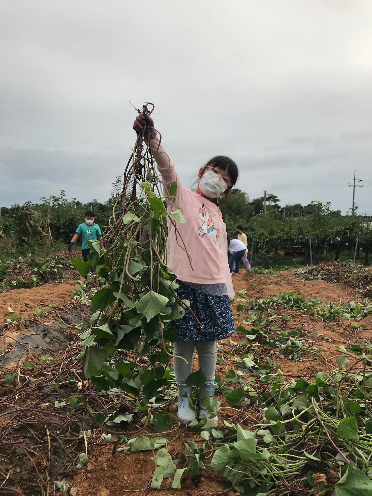 상처가 나지 않도록 삽으로 고랑 옆을 들춰 올리고 나머지는 다 손과 호미오 작업한다. 고사리 손으로 흙을 파면서 캐내는데 그러다 큰 것이라도 나오면 여기저기서 함성이 절로 나온다. 큰 것은 얼굴만 하다는 말로는 부족할 정도다. 미소를 넘어선 함박웃음이 절로 지어진다.