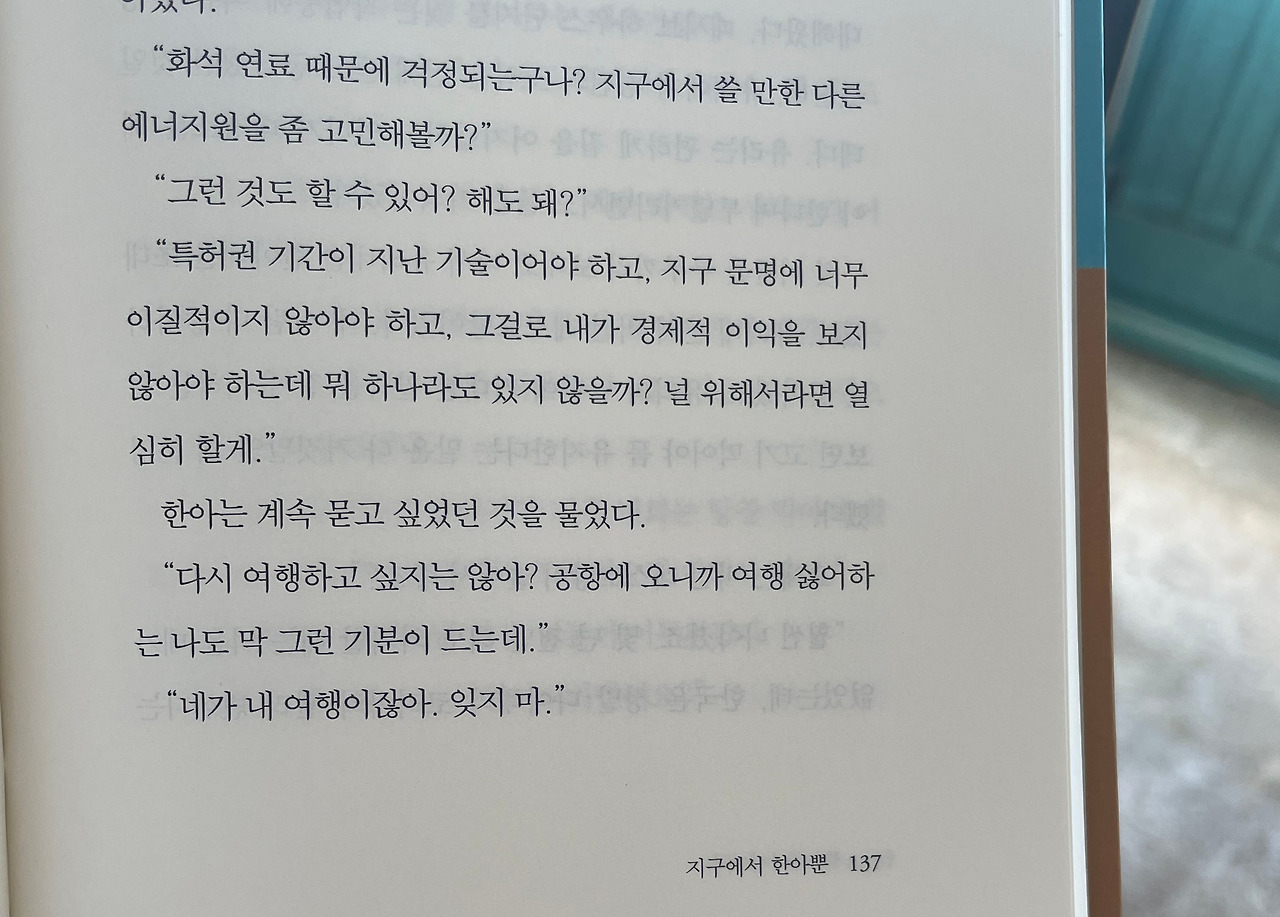 연애 감정의 사랑이 아닌 또 다른 사랑도 있다. 경민이었던 엑스의 사랑은 ‘앎’에 대한 열망이자 이 또한 ‘우주적 사랑’이다. 마음에 남았던 대목이 있다. 한아의 사랑만으론 엑스를 지구에 붙들어 둘 수 없었다는 말. 결국 엑스는 한아가 준 사랑에 대한 가치를 뒤늦게 깨닫게 되지만 그건 ‘앎’에 대한 사랑의 상실 탓이 아닐까. <가진 게 없어 줄 것도 없는 엑스는 언제든 떠날 준비가 되어있다>는 말도 좋았다. 늘 떠나고 싶은 내게 무언갈 잃을까 두려움 없는 경민 엑스는 멋있게 느껴지기까지 했으며, 나를 붙들고 있는 닻들은 무엇이고 어느 정도의 무게를 가지고 있을지, 나를 붙잡아주는 사랑을 돌아보게 했다.