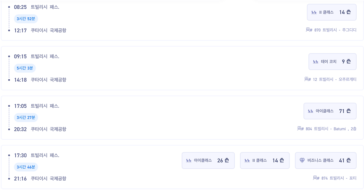 쿠타이시까지 가는 야간열차가 있으면 러시아에서 여행할 때의 추억을 떠올릴 겸 타고 싶은데 9/5 현재 기준 열차가 시간은 아래 사진처럼만 배차되어있어서 우선 오전 열차를 예매할 예정이다. 열차 예매는 일주일 정도 전에 오픈된다.