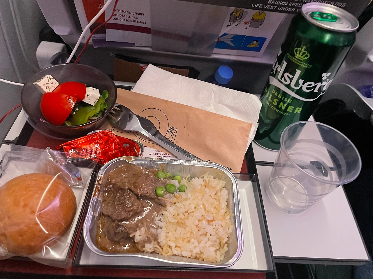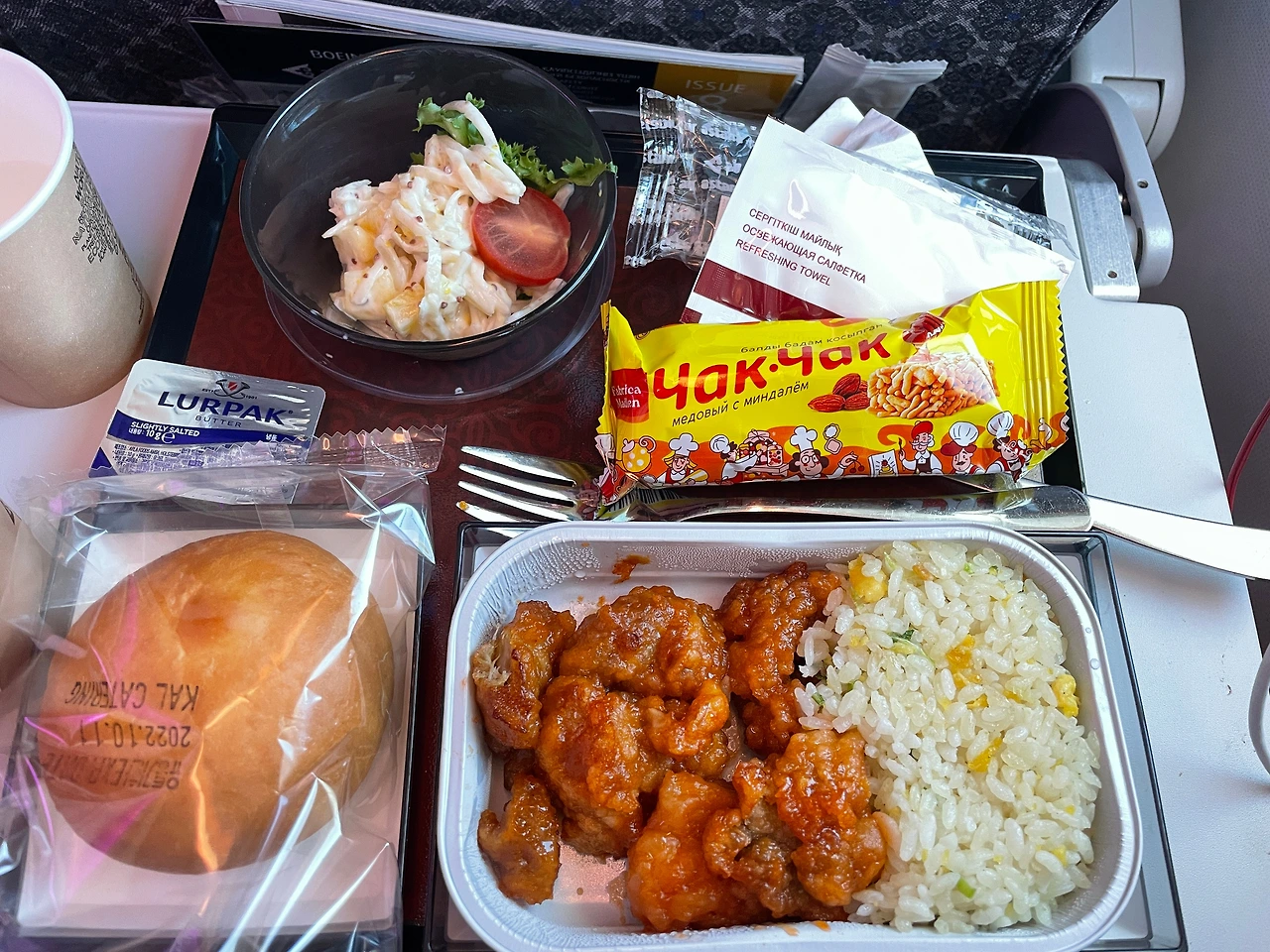 기내식 너무 오랜만에 먹어서 행복해하면서 싹싹 다 먹었는데 역시 기내식은 치킨이 모험 없는 선택,, 에어 아스타나 기내식 잘하네,, 양념 치킨 같은 맛,,