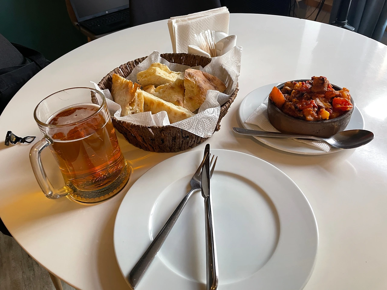 그래서 길 건너 문 열린 곳에 냅다 들어가서 오자후리랑 빵, 맥주를 시켰다. 오자후리는 돼지고기 감자볶음 같은 건데 고수가 들어가는 경우가 많아서 고수 못 먹으면 빼 달라고 요청을 해야 한다.