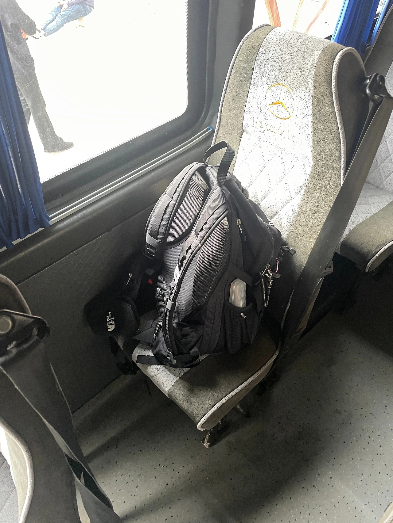 9시 10분에 도착했는데 이미 몇몇 자리는 잡혀있었다. 자리 찜을 잘해놔야 되는 게 맨 뒤에 서양인 2명이 앉아있다가 배낭을 메고 먹을 걸 사러 갔다 오는 사이에 기사 아저씨가 그들이 앉아있던 자리에 짐을 실었다. 둘이 떨어져서 앉게 된 상황인데 다행히 혼자 온 다른 서양인 남자가 자리를 바꿔줘서 평화롭게 출발!