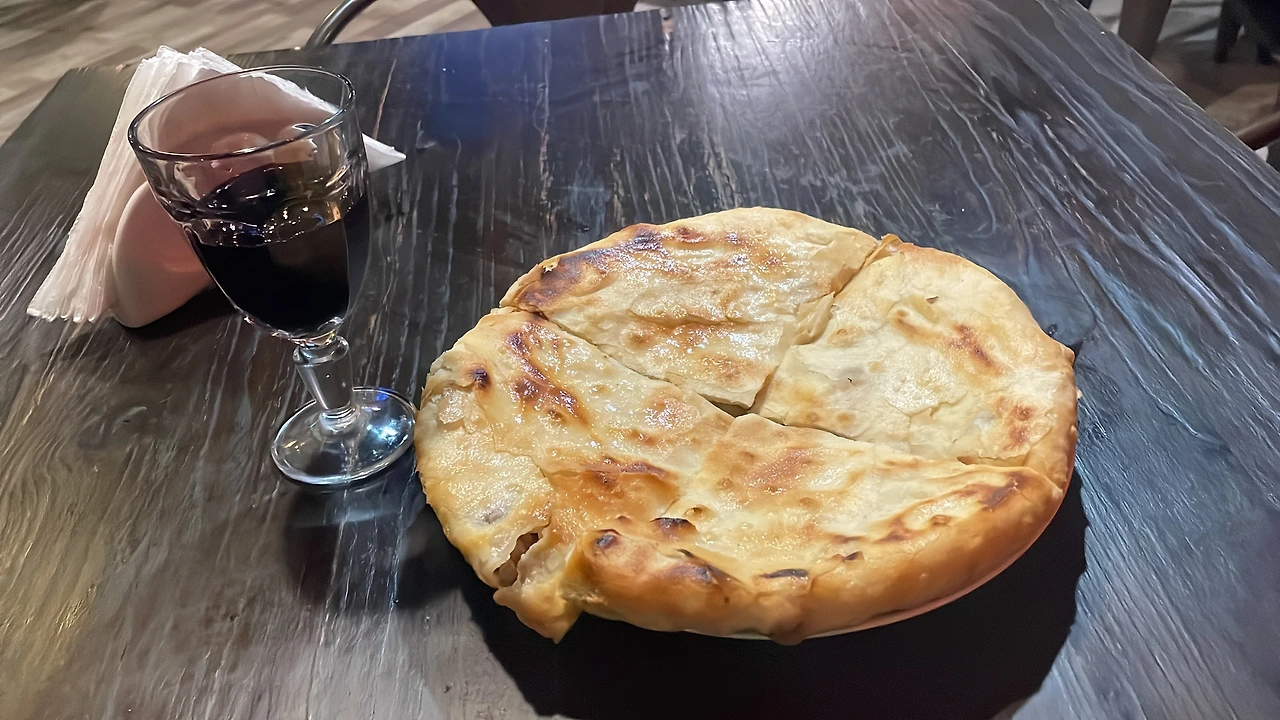 굽다리(하차푸리인데 안에 치즈 대신 고기를 넣은 것) 15라리 + 와인 1잔 7라리 + 서비스 차지 10% = 24라리