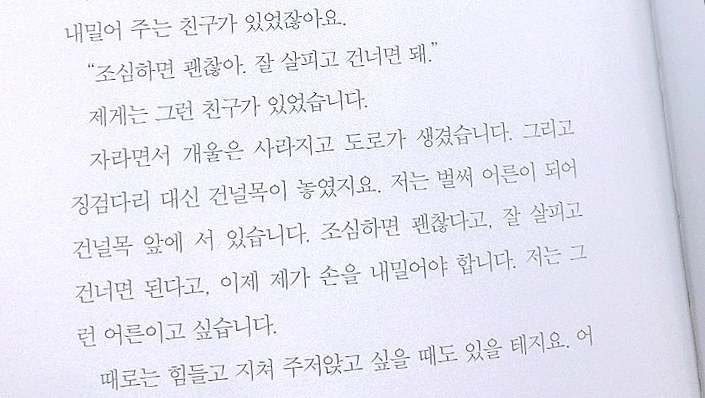 우리 그래도 덜 힘들게 덜 아프게 덜 무섭게 그 시기를 건널 수 있도록 서로에게 작은 건널목이 되어 줄 수는 있습니다.