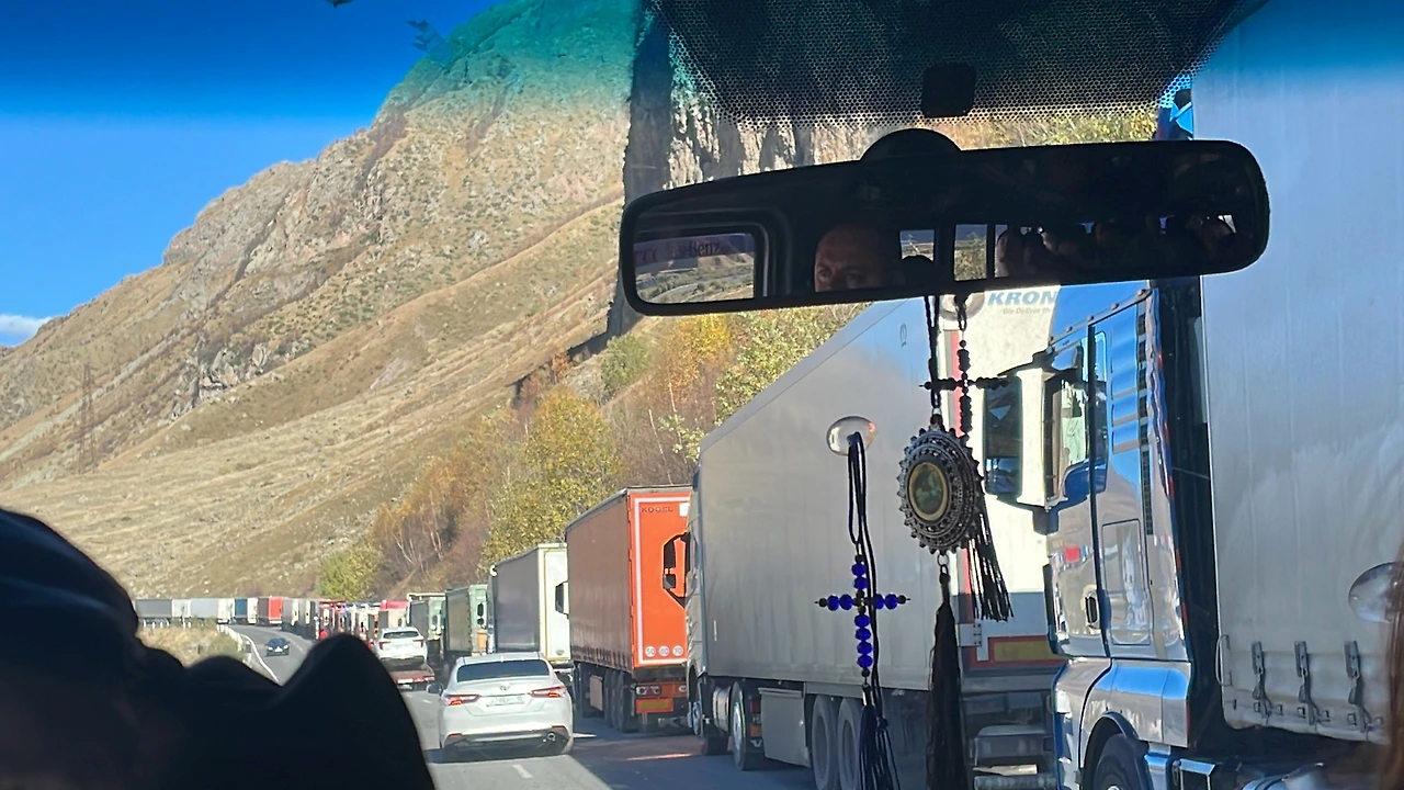 카즈베기에 가까워지는 거 같다고 느낀 게 사진에서 본 것처럼 러시아에 가려고 탑차들이 쭈우욱 줄을 서고 있었다.