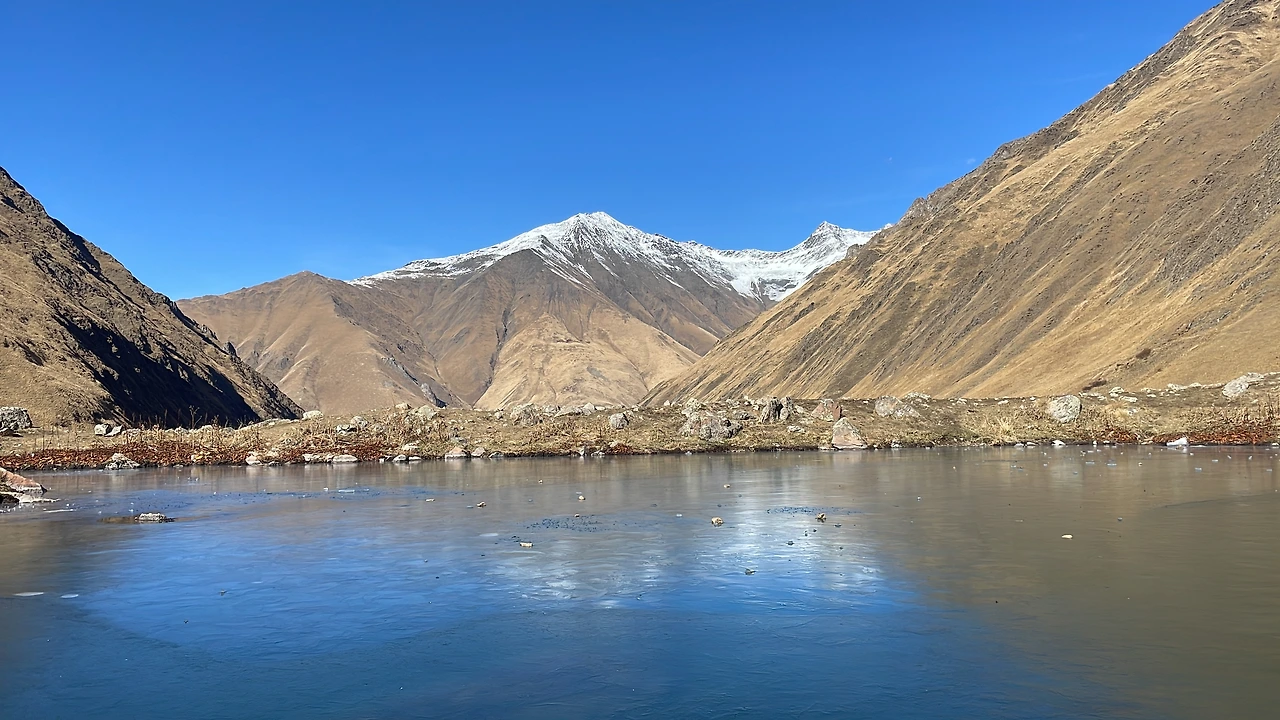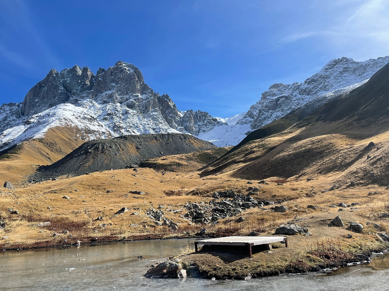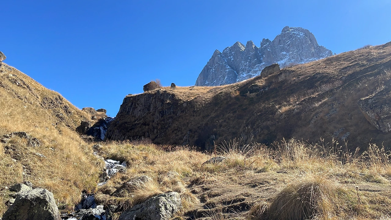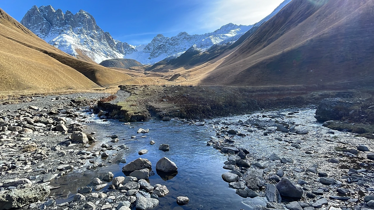 우리는 반영을 볼 수 있는 <Chaukhi Lake> 여기를 가려고 했는데 걷다 보니 그 옆쪽 폭포에 도착.. 설산이 가까워지니까 흐르는 물 따라 얼음들이 많이 얼어있었다.