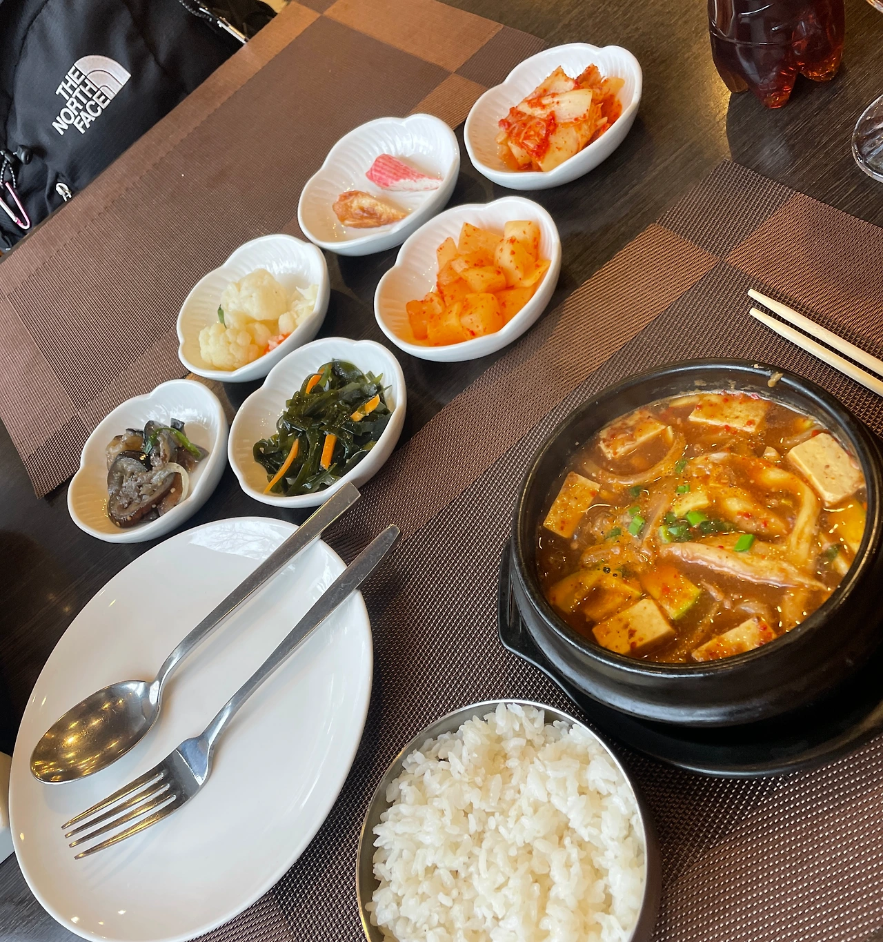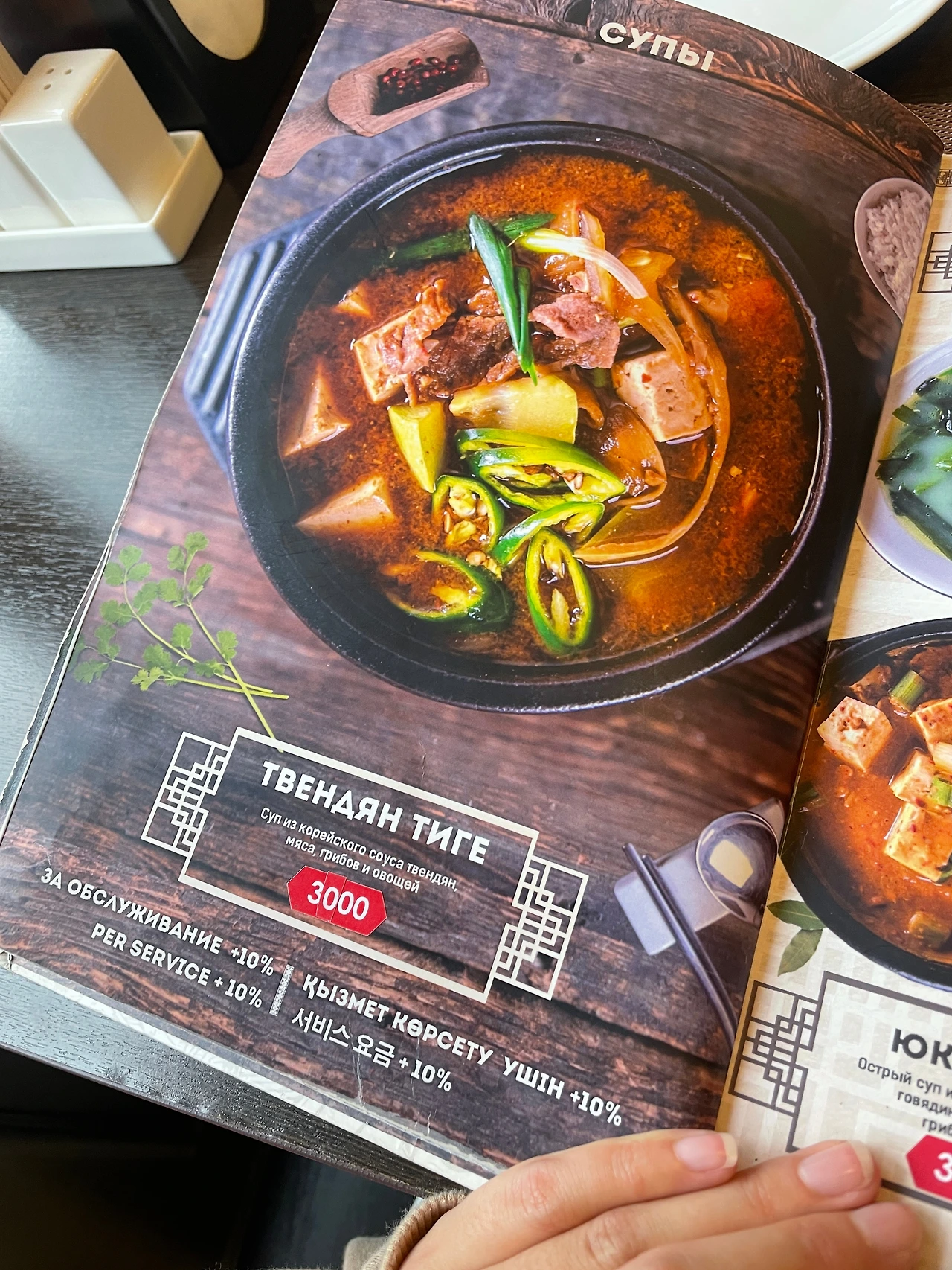 그리고 내가 알마티에 고작 몇 시간 있으면서 느낀 건 알마티 사람들은 정말 작게 말한다..(?) 목청 큰 조지아에 있다 와서 그런가 택시 호객도 엄청 속삭이는 느낌으로 하고 나도 목소리가 작은 편인데 여기서 내가 만난 사람들은 정말 나보다 더더 작았다. 직원이 너무 소곤거려서 잘 못 들었지만 어떻게 주문은 했다. 매콤vs된장찌개 중에 고민하다가 어차피 곧 한국 가니까 웬만하면 맛있을 거 같은 차돌 된장찌개로 선택!