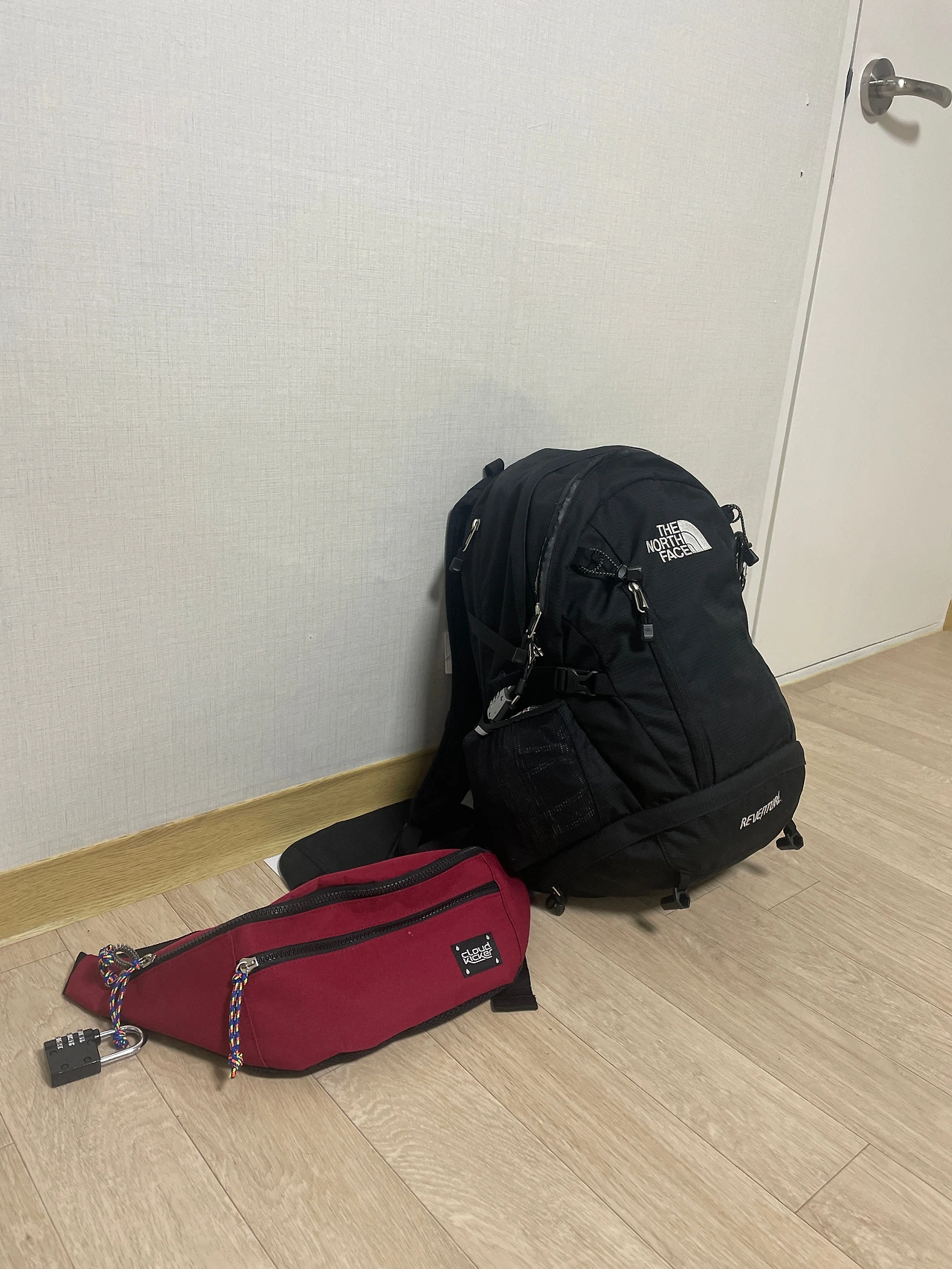 러시아, 유럽, 조지아 등등 이때까지의 여행에서 앞 배낭 역할을 했던 30L 노스페이스 가방이 이번 여행의 메인 가방! 오스프리 윗 뚜껑 떼고 가져가고 싶었는데 내건 등판이 딱딱한 재질이라 안 접혀요.. 비엣젯 기내 수화물 규정이 깐깐하다고 해서 오며 가며 마음 졸이느니 거지같이 다니자~! 하면서 도전!