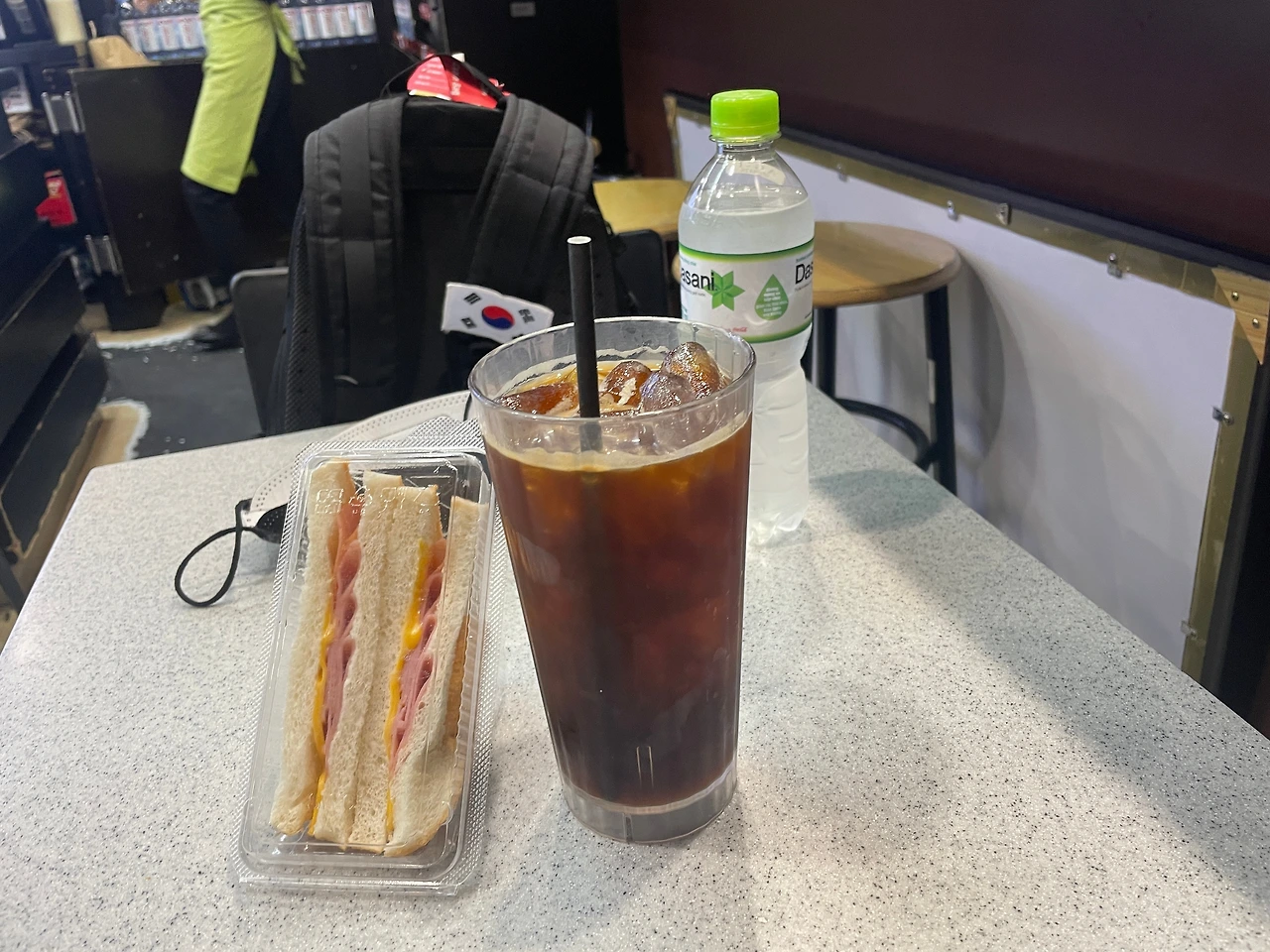 출국장에 있는 카페 Puro Gusto가 24시간이라 여기서 아이스 아메리카노랑 샌드위치 사 먹음. 14만 7천 동, 공항인 거 감안하면 나쁘지 않은 가격.