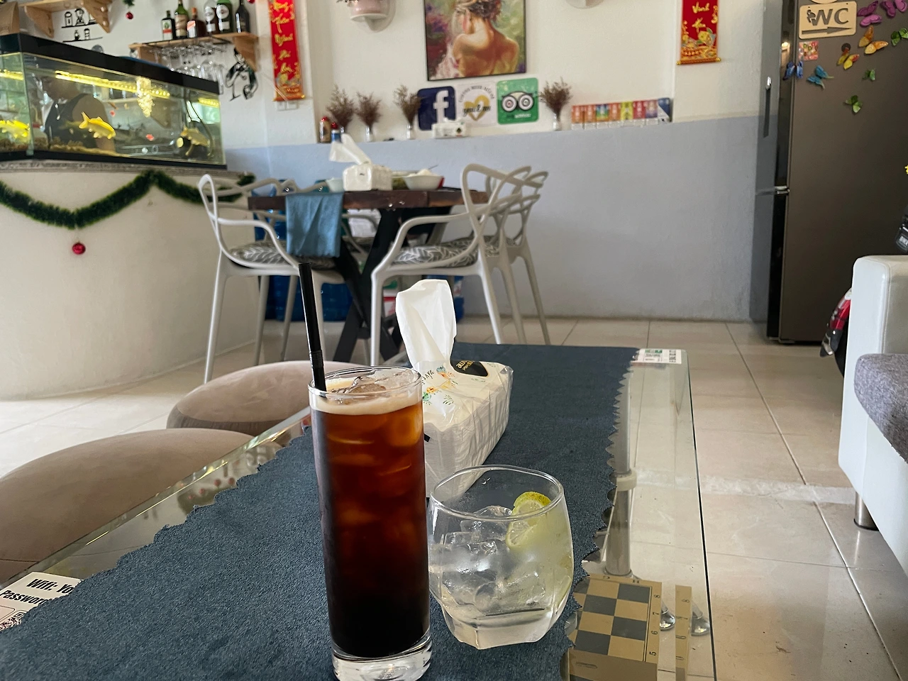 숙소 쪽으로 돌아와서 숙소 근처 카페에 가서 헥헥 거리며 앉으니까 시원한 물부터 주시는 친절한 주인아주머니! 아이스 아메리카노는 4만 동. 2천 원 정도로 베트남 물가 치고 저렴한 편은 아니지만 일반 식당에서 블랙커피를 시키면 항상 달달한 커피를 줘서 아아가 그리웠던 터라 생명수 마시듯 마셨다.