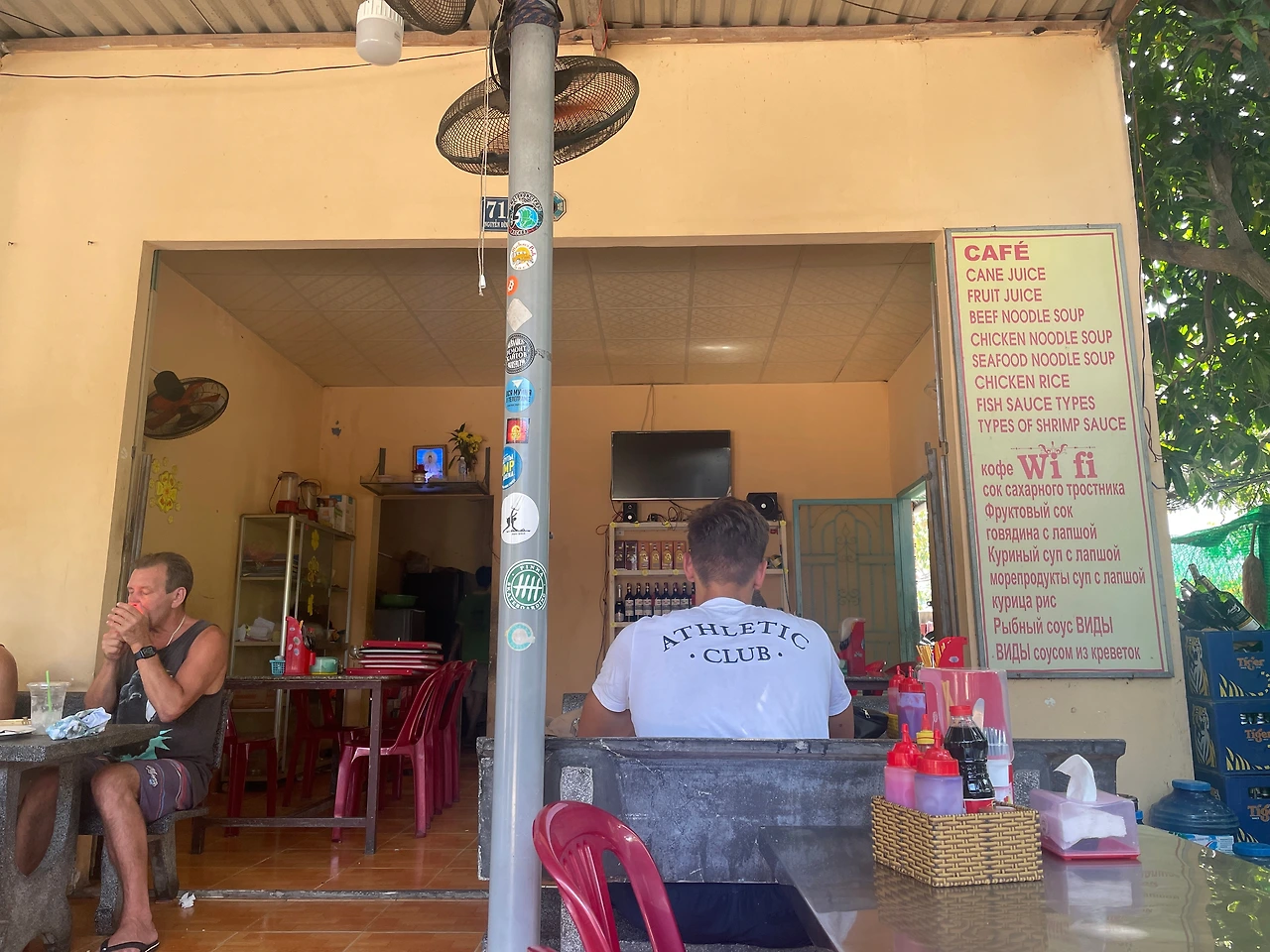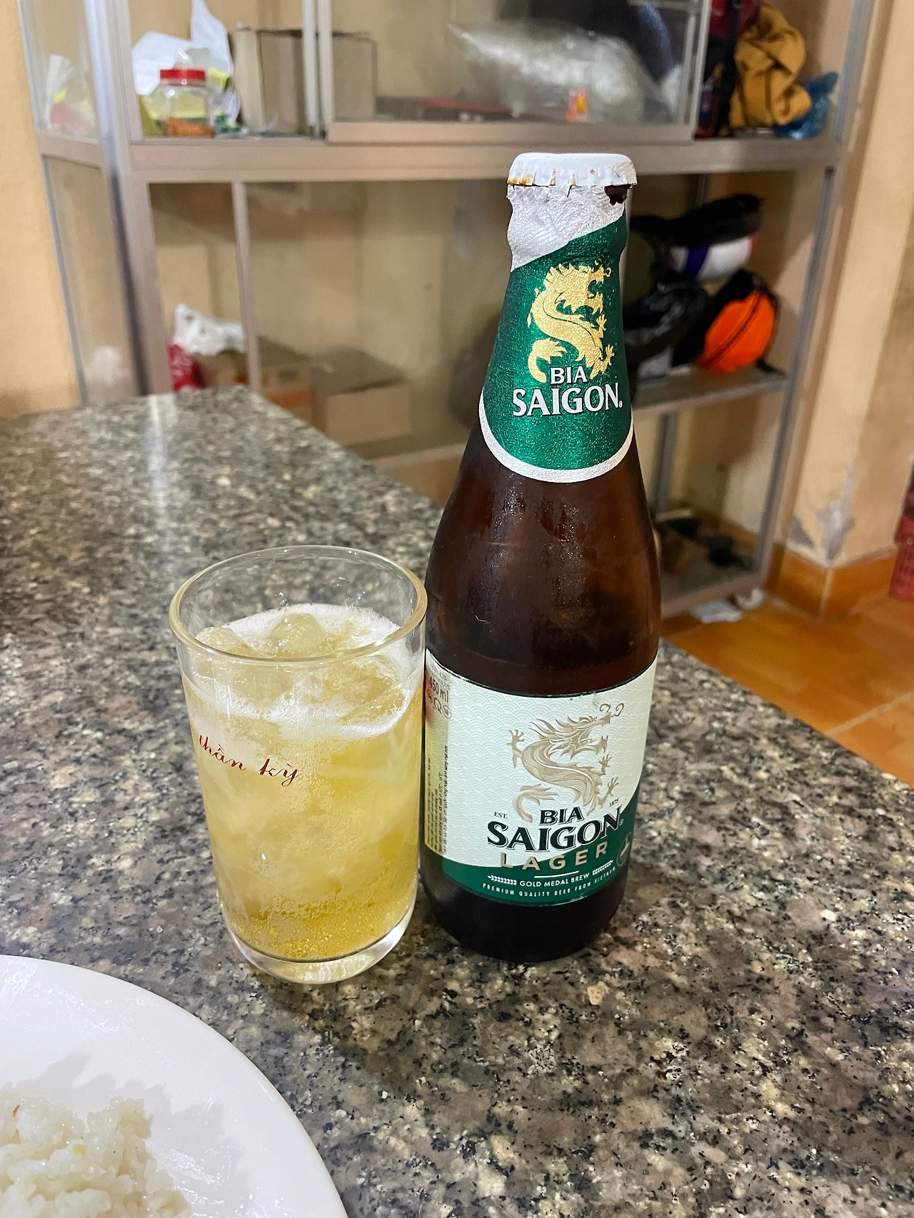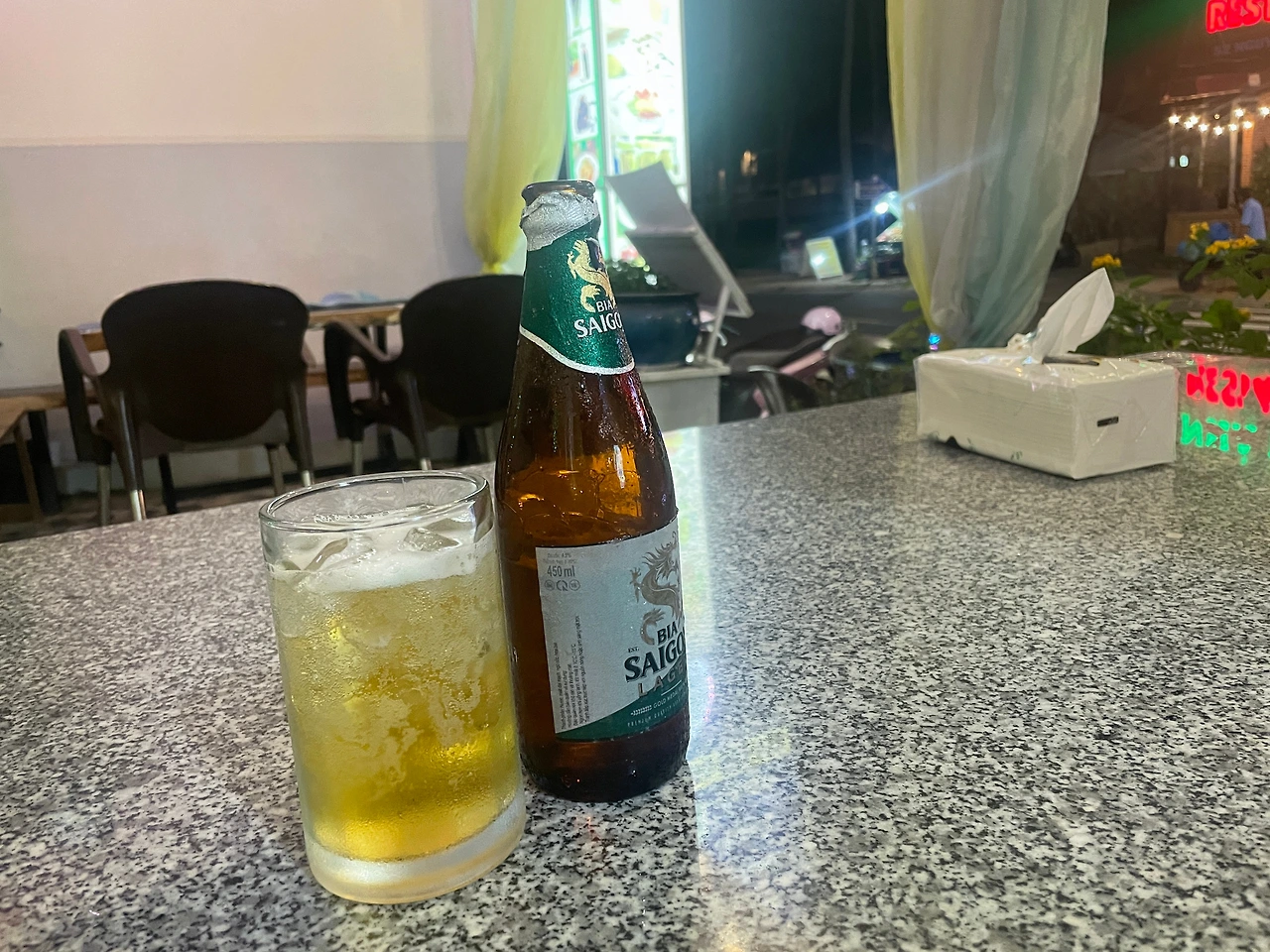 약속시간까지 일몰을 보다가 약속한 식당 (아침에 반쎄오 먹은 곳) 앞으로 갔는데 안 계셨다. 식당에서 만나기로 했는데 소통이 잘못됐나 싶어서 숙소로 돌아갔다 왔는데 알고 보니 구석 자리에 계셔서 안 보인 거였음.. 숙소까지 갔다 오는 것만으로도 땀이 엄청나는 날씨였다. 너무 더워서 어쩔 수 없이 맥주 마심(?)