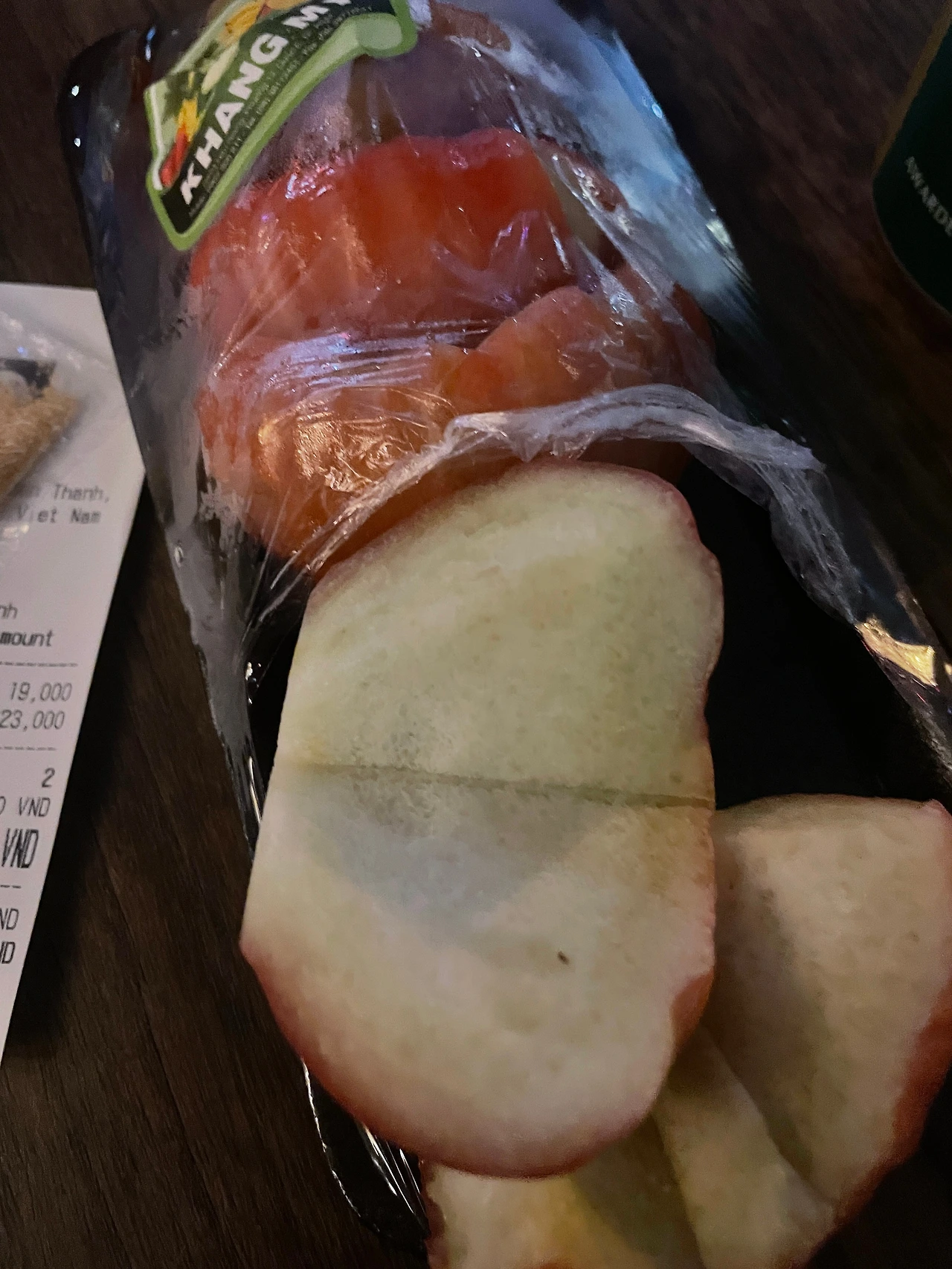 배랑 사과라기보단 대추랑 사과 중간 맛이랄까! 손질된 7조각에 23,000동, 아마 편의점에서 구매한 거라 시장이나 마트는 더 저렴하지 않을까?