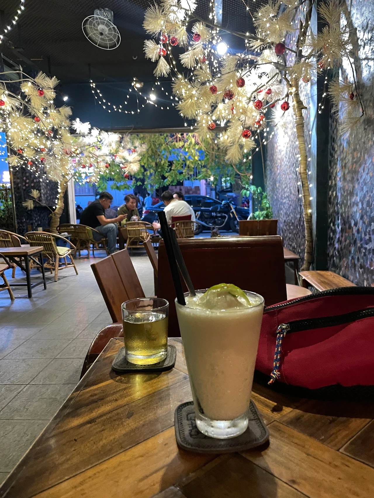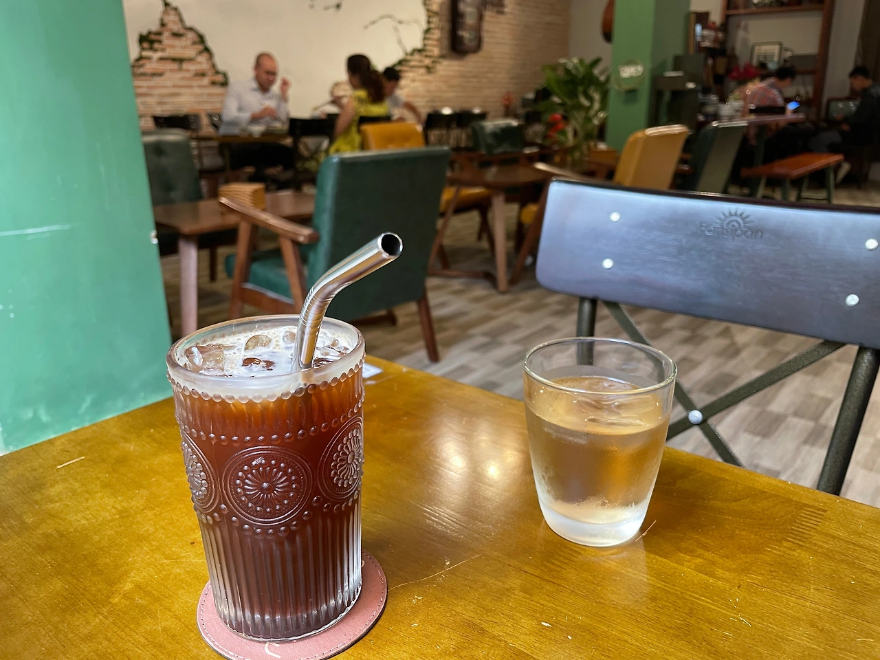 나오자마자 골목에 예쁜 카페가 있어서 들어왔다. 음식도 같이 파는 곳이라 그런지 동남아 음식 향이 코를 찔렀다. 후각은 제일 빨리 마비되니까요.. 그냥 자리 잡고 앉았다.