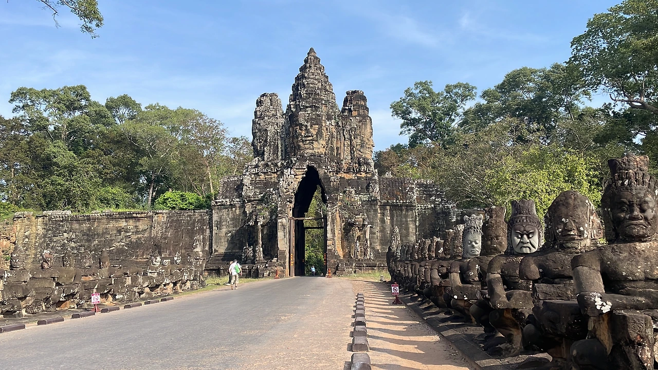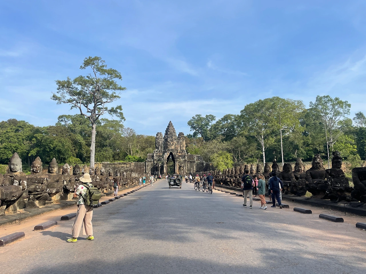 너무 좋았던 앙코르 와트를 뒤로하고 앙코르 톰으로 향한다. 단체 투어라 그런지 차에 타니까 시원한 물을 줬다. 앙코르 톰의 규모는 앙코르 와트보다 훨씬 큰데, 왜 앙코르 와트가 가장 큰 사원이라고 하느냐=앙코르 톰은 마을이었음. 앙코르 톰이라는 마을 안에 바이욘 사원이 있는 것! 입구에 우유 휘젓기 동상과 자야바르만 7세 특유의 사면상이 있다. 우유 휘젓기 동상은 데바와 아수라 즉 선신과 악신으로 좌우로 줄 서 있다.