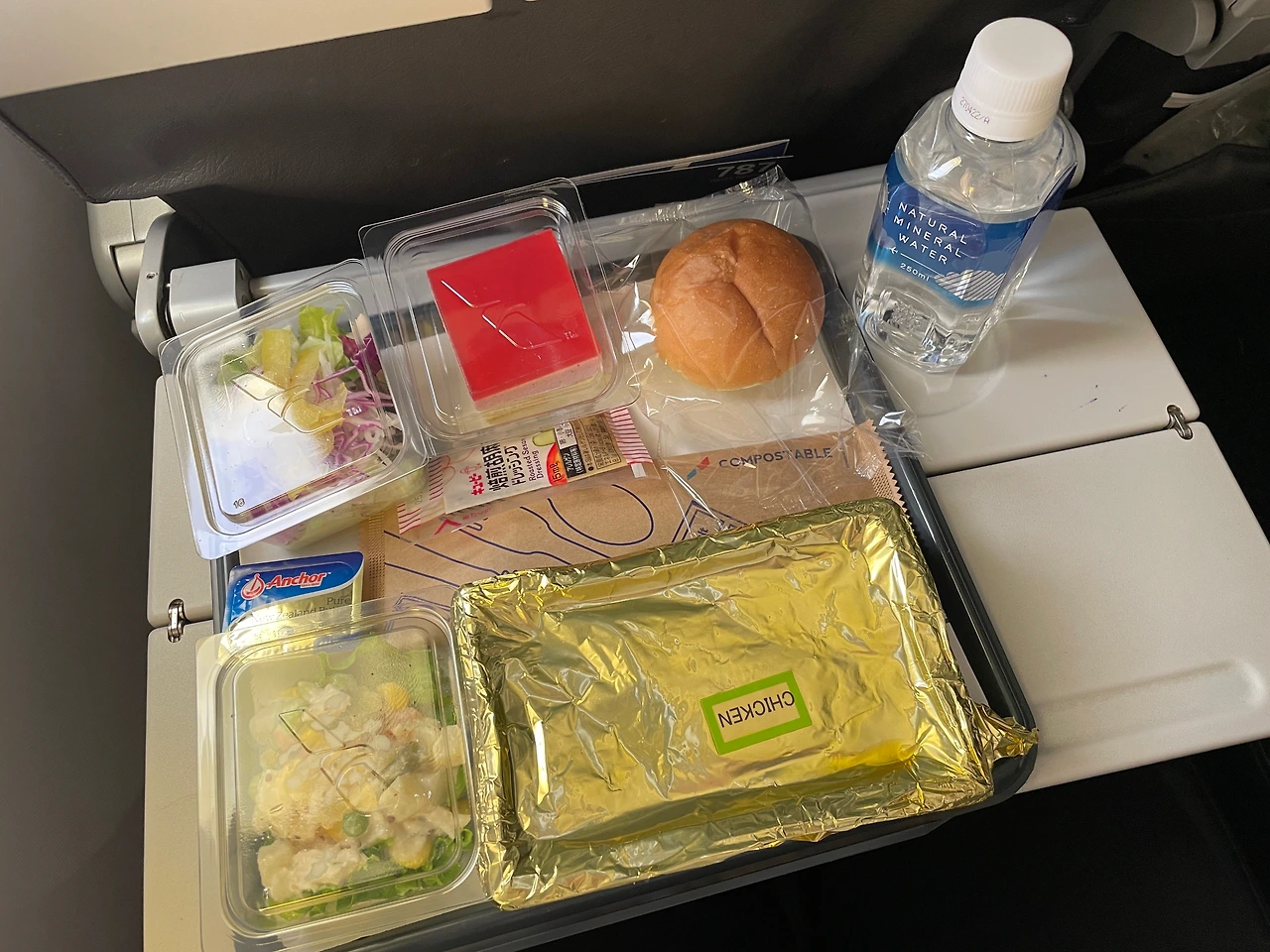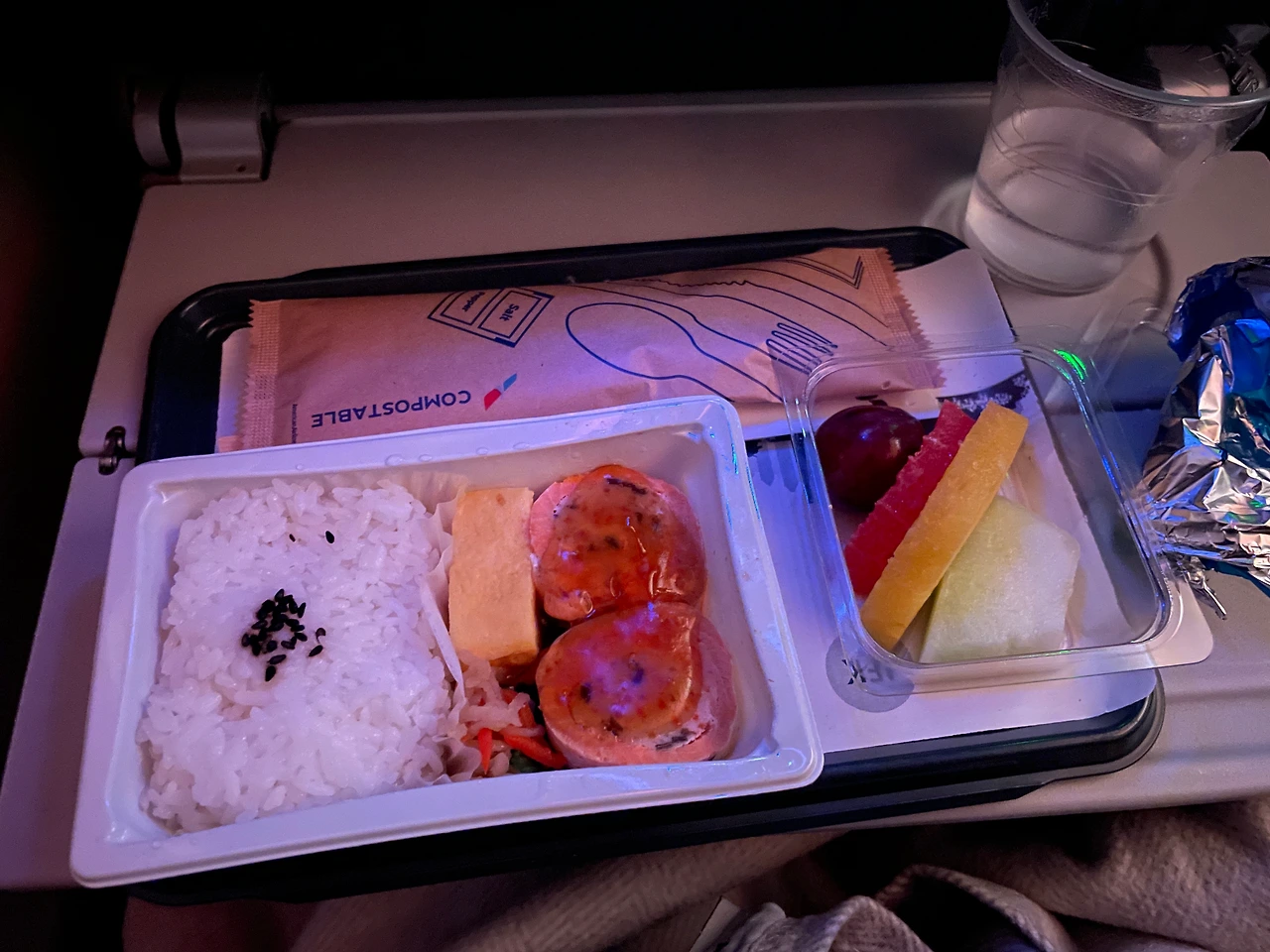 이번에도 역시 타자마자 기절잠.. 옆자리 아저씨가 기내식 받는 소리에 일어났다. 이 분은 아마 비건이라서 먼저 신청한 기내식을 받은 거 같았다. 아저씨가 식사가 다 끝나갈 때쯤 내 기내식이 욌다. 치킨 커리랑 매쉬포테이토&포크 중에 고르는 거였다. 먹고 싶은 건 매시포테이토인데 항상 이런 순간엔 치킨커리를 선택하게 된다. 아무래도 치킨은 실패가 없다는 경험이 이끄는 걸까?