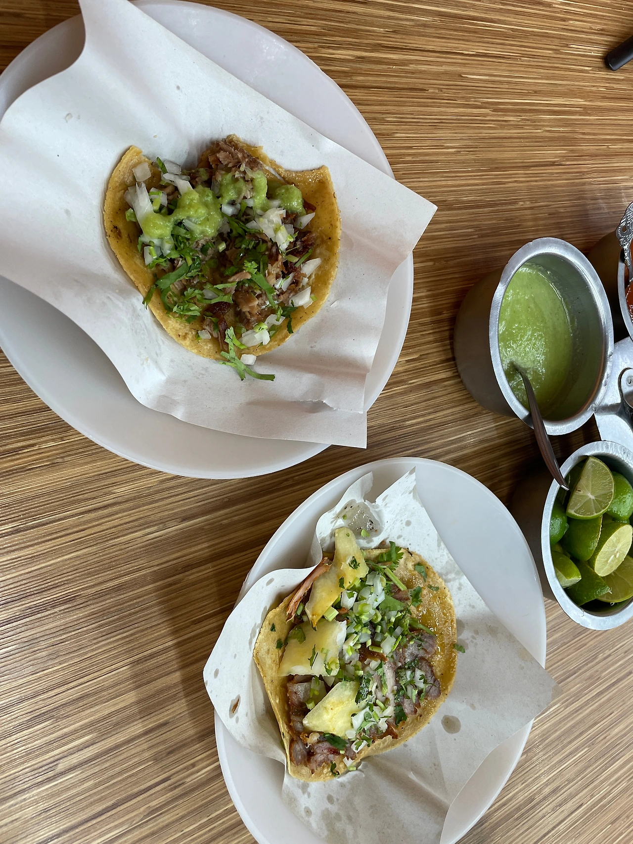 구석 자리로 부탁하고 소양지(suadero)로 추정되는 타코 1개, 돼지고기 타코 1개, 맥주 1개를 주문했다.