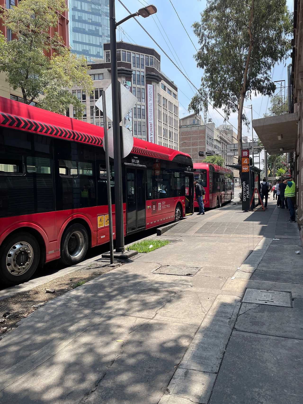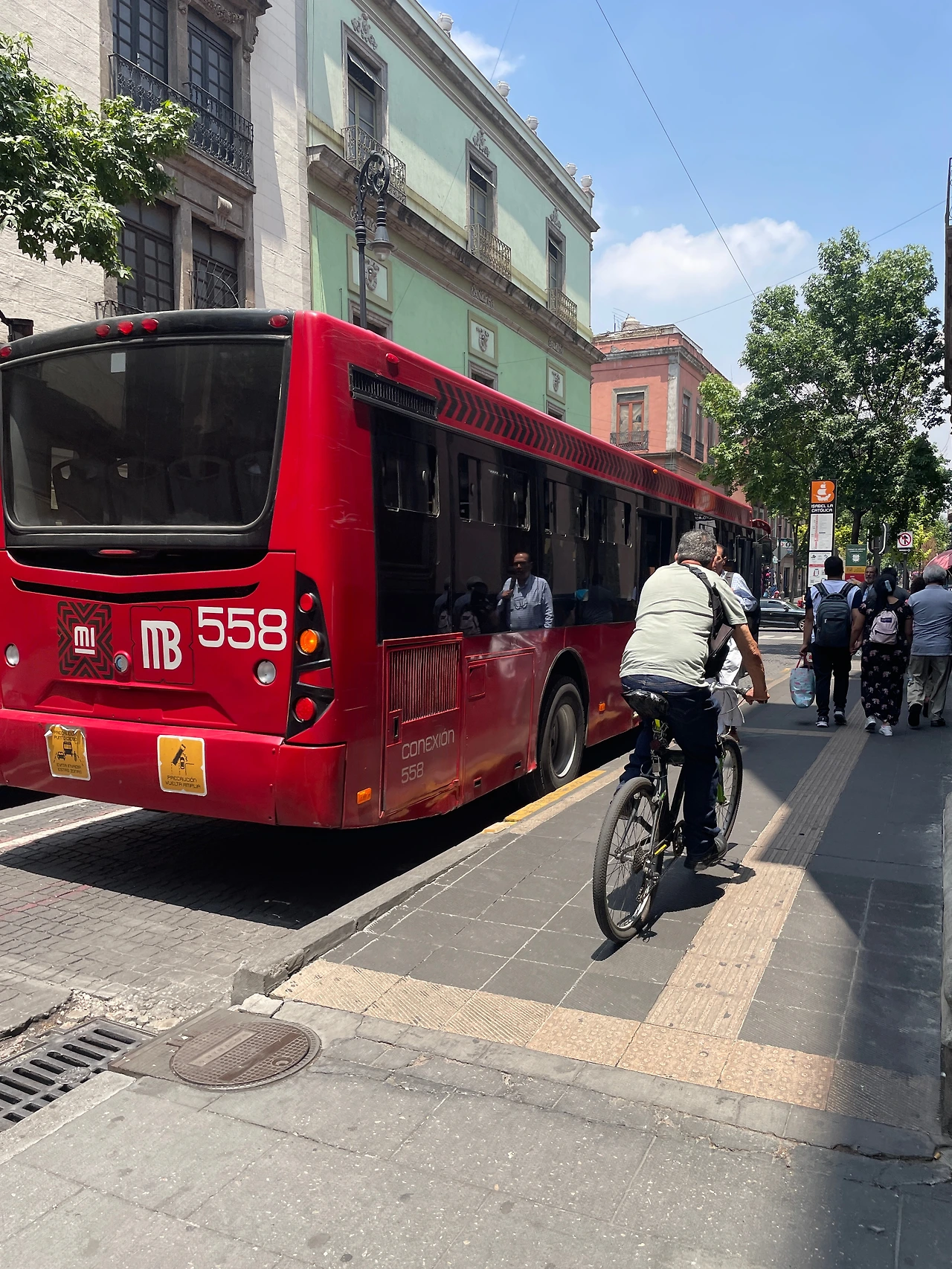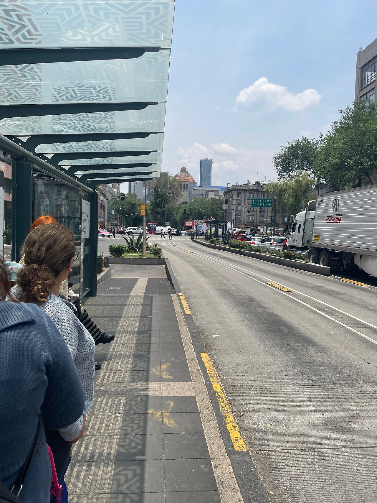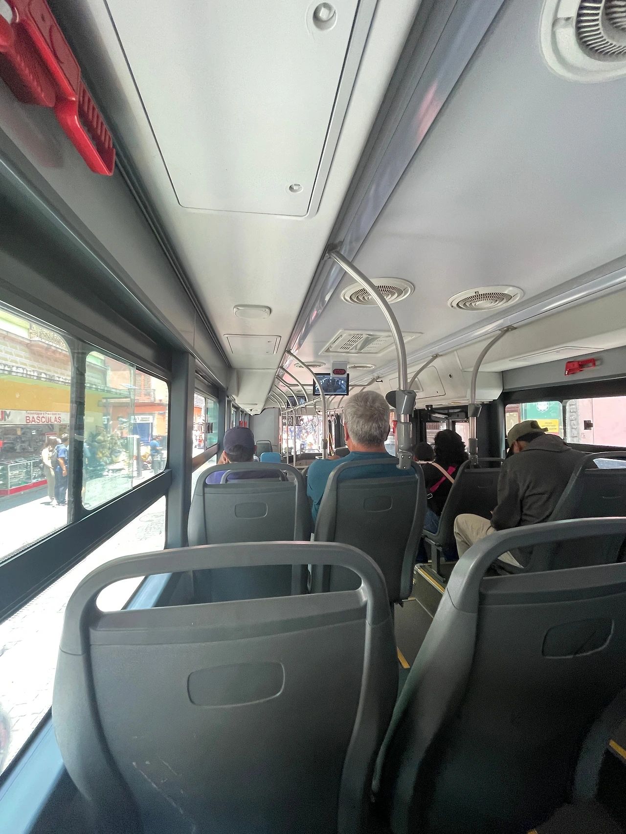 다음 4번 메트로 버스를 타고 구경을 하면서 가는 길. 소깔로 광장이 있는 쪽을 벗어나고 나니 인구 밀도가 확 줄어드는 게 눈에 보였다. 근데 가다 말고 한 정류장에서 전부 다 내리라고 했다. 모든 메트로 버스가 거기가 종점인 마냥 서있었다. 내리는 승객한테 왜 내리는 거냐고 물어보니까 또 스페인어로 뭐라고 설명해 주셨는데 못 알아들었다.. 아마 처음 버스를 타려고 했을 때 기사님이 얘기한 무언가의 문제 때문인가 보다 예상만 했다.