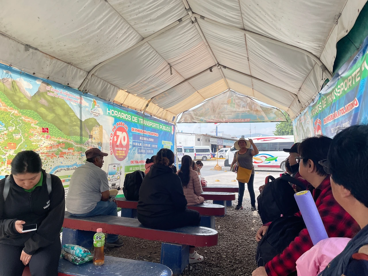 버스 정류장에 9시 5분쯤 도착하니 멀리 한 아주머니가 천막 아래서 "똘랑똥꼬~"하면서 손짓하신다. 이미 많은 사람들이 와있었고 나보고 저기 뒤쪽에 앉으라는 거 보니 선착순으로 탑승하는 거 같았다.