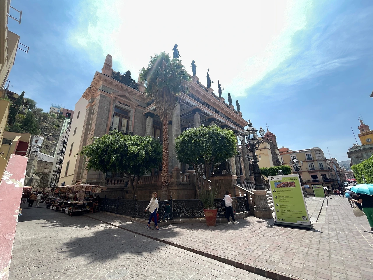 그렇게 내려오고 나니 어제 잠깐 둘러본 과나후아토가 전부가 아니었다. 과나후아토는 그냥 예쁜 마을 구경 정도로 생각하며 극장마저 예쁘다고 생각했던 후아레스 극장이 있었다. 바로 앞에는 우니온 정원이! 정원은 작았지만 그늘이 많이 질 수 있도록 나무를 반듯반듯하게 깎아두었고 사람들이 가득했다.