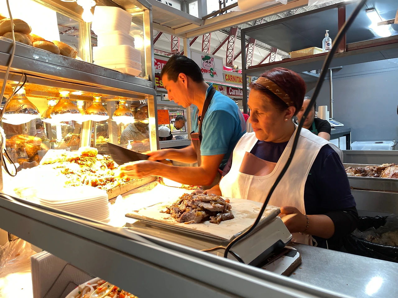 족발 타코 말고 토르타스를 주문했다. 주문하자마자 먹으면서 기다리라는 건지 작은 빵에 족발 올려서 시식용을 준다. 뭔가 한국인들이 좋아할법한 서비스였다. 족발만 탕탕 썰어서 팔기도 했는데 저울의 재고 가격을 말하고 서비스를 더 올려서 포장해 주는 것도 한국인의 정이 느껴지는 인상적인 모습이다. 단골인 것처럼 보이는 사람들과는 잠깐 얘기도 나누시며 특정 부위 위주로 썰어서 올려주기도 하신다. 참 정겨운 모습.