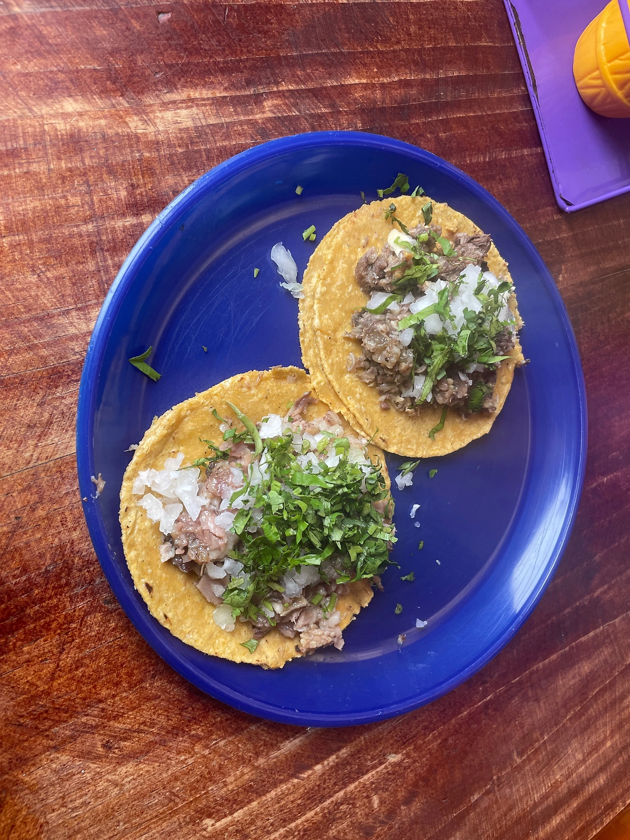 마침 잘 됐다 싶어 나갈 준비를 했다. El charrito 라는 타코집이 궁금했는데 타코를 식사로 먹고 싶지는 않아서 언제 먹나 싶던 참이었다. El charrito 가는 길이 우리 숙소 옥상에서 보이는 성당 가는 쪽이었다. 타코를 먹고 한번 올라가 봐야지. 여기는 타코가 저렴하고 맛있기로 유명하다더니 3시인데도 사람이 많았다. 타코 하나에 15페소 혹은 20페소, 추천해 달라고 한 거랑 OYO랑 해서 두 개를 시켰다.