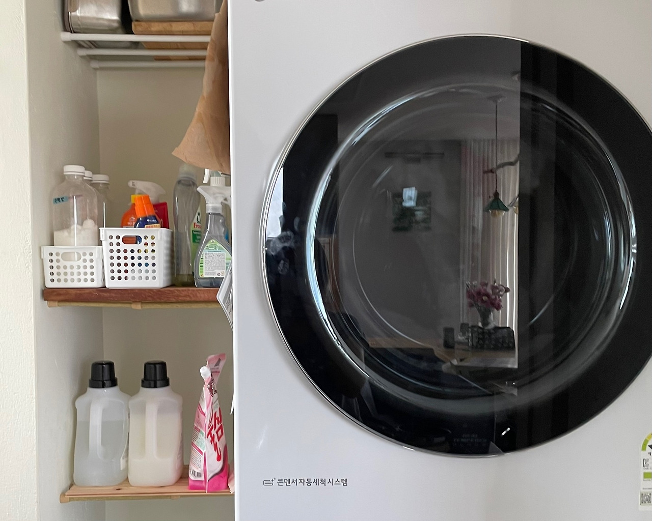 부엌에 딸린 문을 열면 세탁기와 건조기가 있고, 그 옆에 있는 보일러실 사이에 세탁 바구니가 있다. 그리고 그 앞에 6단 선반을 넣어 평소 잘 쓰지 않는 이런저런 물건과 양파, 감자 등 실온 보관 채소와 온갖 세제가 있고 보일러실문과 선반 사이에 분리수거용 쓰레기통이 있다. 그 작은 공간을 효율적으로 쓰겠다고 나름 머리를 짜낸 집념의 결과물이자 극강의 효율적인 공간 배치였다.