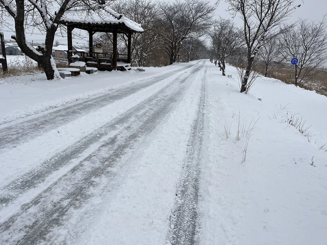 그 길은 미끄럽지 않았다. 차가 많이 다니지 않았는지, 눈도 적당히 쌓여 있었다. 한참을 안정적으로 달릴 수 있었다. 뒤에서 차가 와도, 앞에서 차가 와도 피하거나 멈추지 않고 달릴 수 있었다. 한시간쯤 달렸을 때, 뒤로 돌았다. 돌아오는 길은 좀 힘들었다. 입김이 위로 올라와 안경에 김이 서렸다. 안경에 서린 김이 옆에서 들이치는 바람과 눈발에 얼어갔다. 앞이 잘 보이지 않았다. 다행히 눈이 다시 내리다보니 자동차가 다니던 길이 덜 미끄러웠다. 안경을 벗고 달렸다.