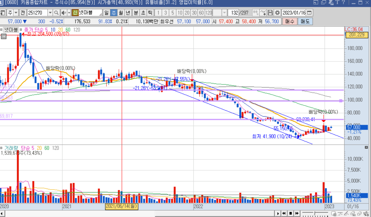 넷마블도 11만원은 '지지' 받는 것 같더니~ 쭈욱 미끄러졌다가 박스를 뚫고 나왔죠? 그럼 어디까지 쉽게 올라갈 수 있을까요? 추세 전환이 언제 나올까요? 어디서부터 모아볼까요?