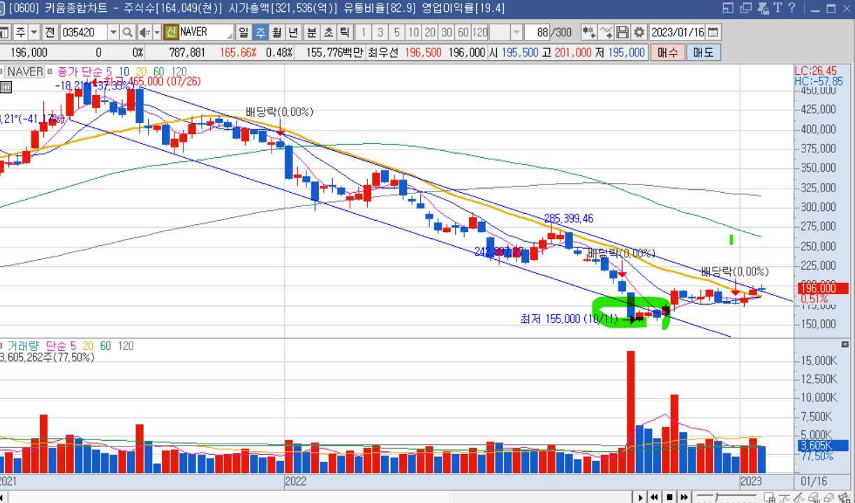 대한민국 IT기업의 선두에 위치한 'NAVER'입니다. 하락 박스에 갇혀있던 네이버는 최근에 하락박스를 뚫고 나왔지요? 10월달에 저희 어머니께 추천을 드렸습니다. naver 과하게 떨어졌다구. 근데 저도 안 샀어여. 왜냐면, 10월까지만 해도 추세에 대해서 인지는 하고 있었으나 매매로 이어지지는 않았거든여. '단타'에 미쳐있었을 때라서, 'naver'를 매수하면 3개월 안에 10~20% 수익을 줄 수 있을 것이란 믿음은 있었지만 구태여 매수하지는 않았습니다. 하지만 지금은 또 박스를 읽고, 믿고, 매매할 수 있게 됐으니 다시 유심히 지켜보고 있습니다. 카카오와 달리 naver가 물적 분할을 하지 않았고(기존 주주의 권리를 과하게 침해하는 물적 분할은 현재 각종 제도를 통해 저지되고 있습니다.)/ 무엇보다 '박스'대로 잘 움직여주는 걸 보니 naver를 좋아하는 사람이 많은 것 같다는 생각이 들기 때문입니다. (지지 받을 데서 자금이 유입되고, 저항 부근에서는 일시적으로 매도를 하고 '추가 하락'을 기다리는 것이지요.)