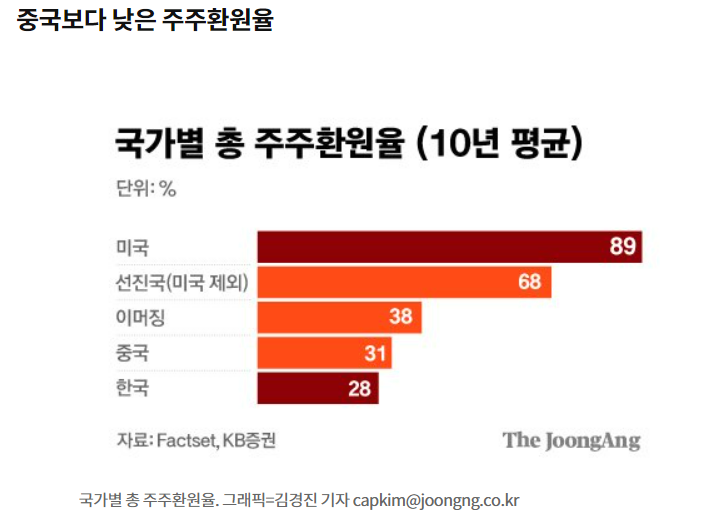 주주환원율이 상당히 떨어지는 국내 주식의 '지배율' 강화에 초점을 두는 '경영진'만
