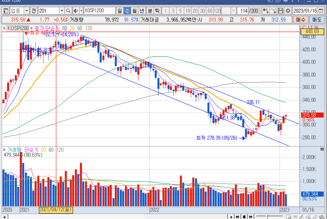 코스피200의 경우에는 이번주에 추세를 뚫고 나왔으며, 재차 눌릴 때 박스 안으로 들어가지 않았네요. 되려, 추세 상단 부분에서 지지를 받고 있습니다. kospi 주봉은 아직 박스 안쪽에서 탈출하지 못하고 있는데요. kospi200은 좋은 흐름을 보여줄지 기대가 됩니다.