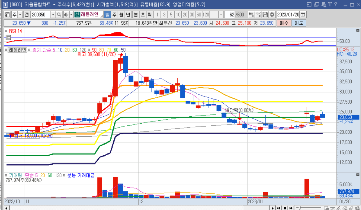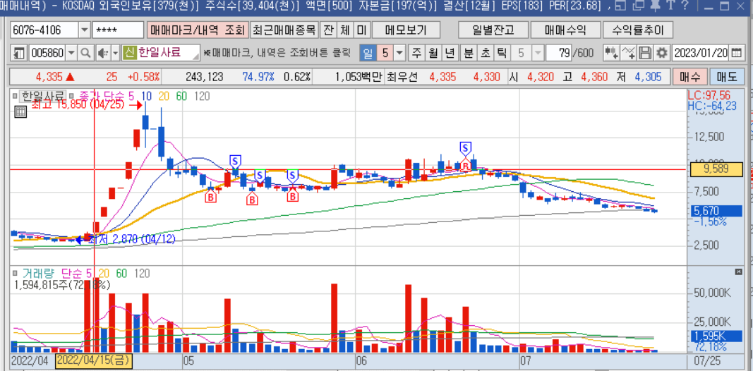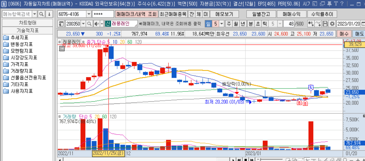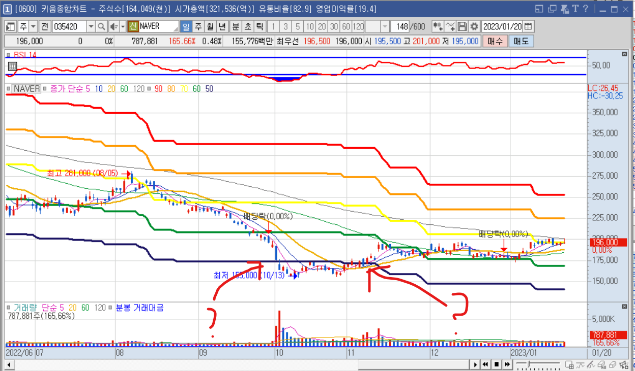 최근 큰 반등 없이. 그저 밑으로 주욱 밀려버린 '래몽래인'입니다. 이건 시장에서 거의 공리로 인정되는 듯한데..큰 반등 없이 '단기간'(1달 내외)에 '반토막' 나버린 주식은 10~20% 정도의 반등을 기대할 수 있습니다. 래몽래인 역시 제가 생각하기에 반등없이 반토막 나버렸기에 모았다가 10% 정도 상승하면 매도해야겠다고 생각했습니다. (결과적으로 더 갔긴 했으나 저는 남색선 부근(고점 대비 50%)에서 모아서 초록색선(고점 대비 60%)에서 매도해야겠다고 생각했습니다.