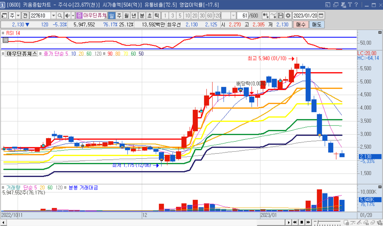 반면의 아래 두 종목은 현재 반토막에 가깝거나, 반토막을 넘어서 단기간에 고점 대비 40% 수준으로 과매도가 심각한 구간입니다. 매수할 가치가 있을까요? 아우딘퓨처스의 경우 올해 1분기부터 3분기 모두 영업이익이 적자를 기록했고 지난 3년간 연간 영업이익이 모두 적자였습니다. 다시 말해서 4분기 영업이익에 기적이 일어나지 않는 이상 4년 연속 적자를 기록한 기업으로서 '관리종목으로 선정'됩니다.