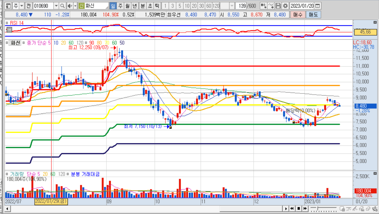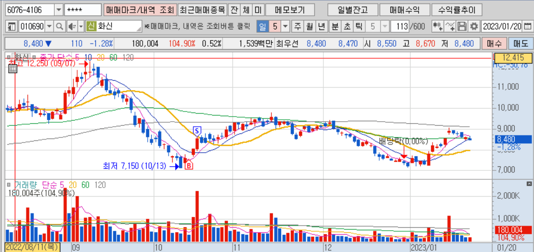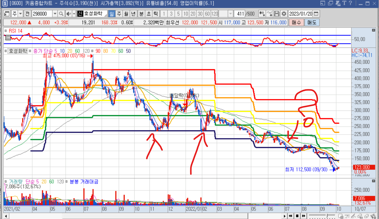 저는 단숨에 초록색 수평선까지 닿았던 '화신'이 과매도라고 생각했고, '더 떨어질 수 있는 가능성'이 충분히 있으므로 '고점' 대비 반토막난 가격대인 '남색 수평선' 부근에서 '추가 매수'를 계획했습니다.