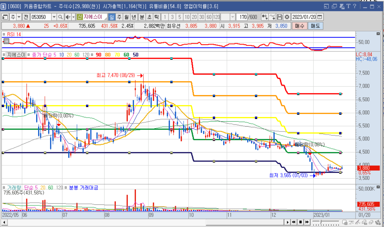 지에스이 역시 영업 이익에는 큰 문제가 있는 것은 아니지만, 최근 '전쟁' 테마의 수급을 통해 1년간 시세를 두 번이나 주었던 종목이기에 '반토막'된 현재의 주가가 '가격적 측면에서' 메리트가 있는지는 불분명합니다.