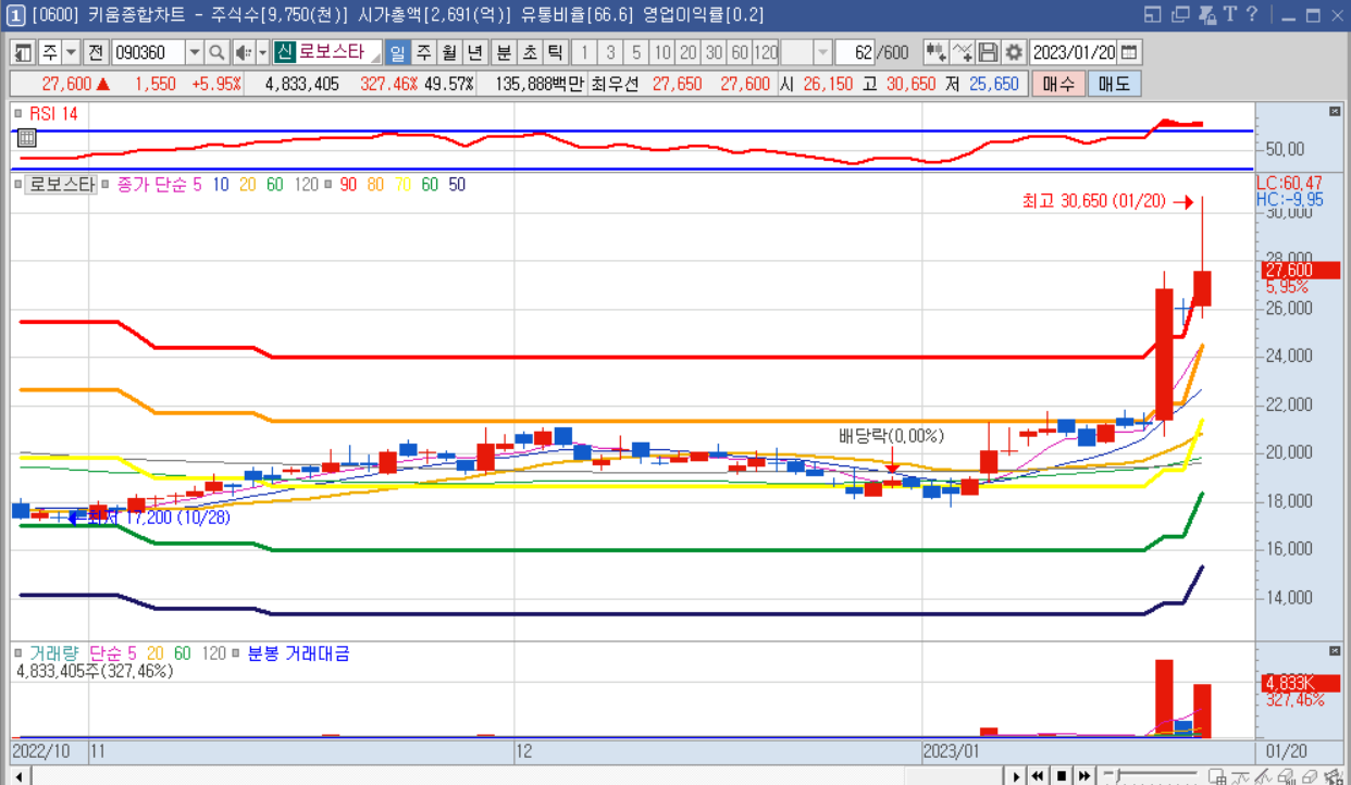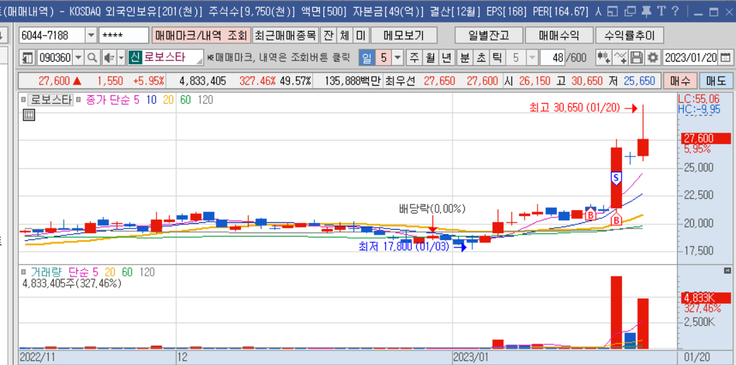 로보스타 역시 고점 대비 80% 부근에서 지속적으로 횡보해주는 '특이한' 상황이 연출됐고, 고점 대비 90% 구간에서 매도할 계획으로 단기 스윙으로 진입하였습니다.(노란색 선 부근을 이탈하면 제가 패배했다고 받아들이려는 마음으로, 노란색 부근까지 분할해서 매집하려는 계획을 세웠었습니다.) 결과적으로 일찍 매도한 것이 됐으나, 어찌 됐든 특이한 흐름만 포착하면 저는 10%~20% 차익 실현을 목표로 매매를 계획합니다.