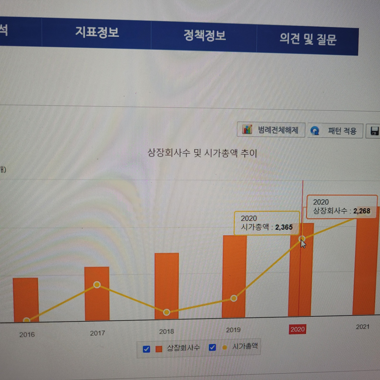 반면, 2020년 한국 주식 시장에 상장된 회사의 수는 2,268 곳이며 각 회사의 시총을 합하면 총 2,365조입니다.